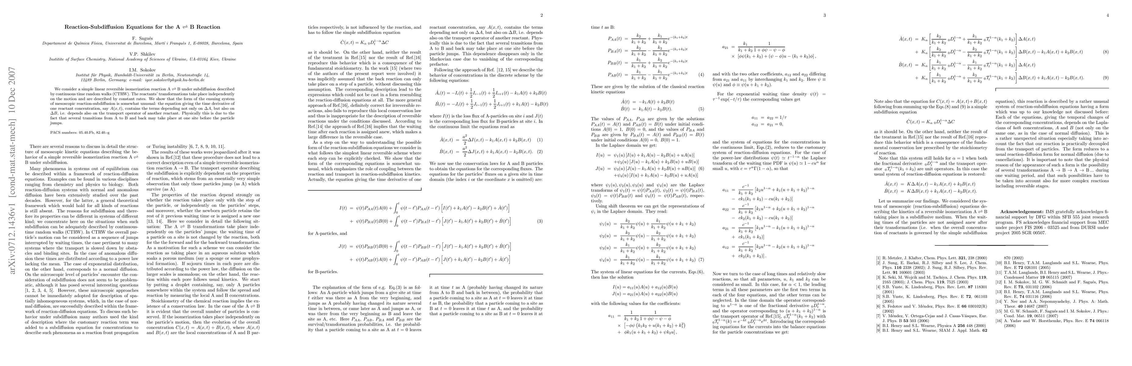 This paper investigates a reversible isomerization reaction A <--> B under subdiffusion conditions using continuous time random walks, revealing an unusual reaction-subdiffusion system where the time derivative of one reactant's concentration depends on the transport operator of another reactant due to multiple transitions at a single site before particle jumps.