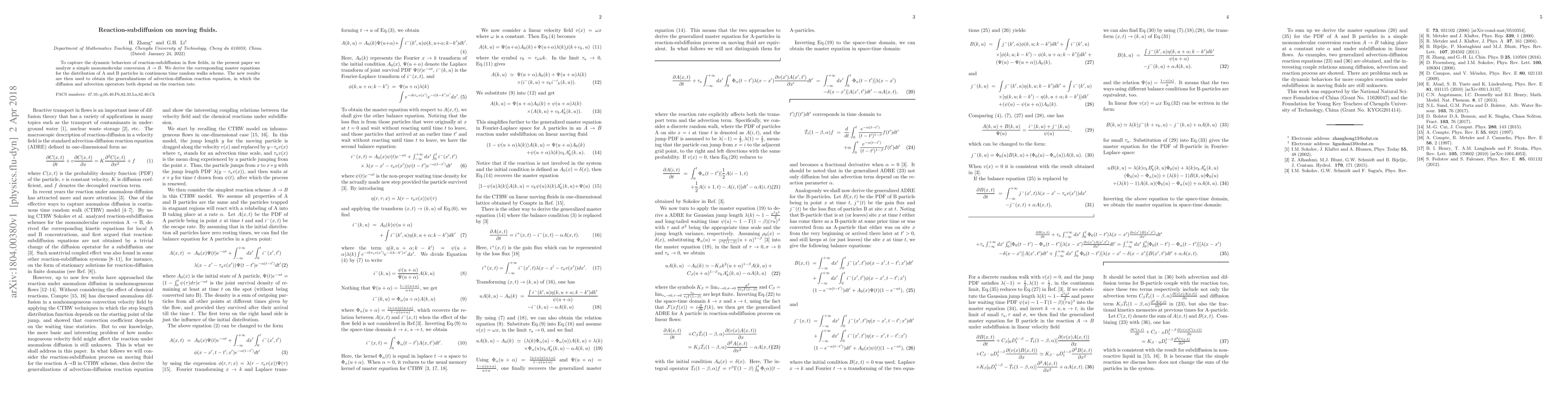 This paper analyzes reaction-subdiffusion in moving fluids, deriving master equations for particle distributions in a continuous time random walk framework. It generalizes the advection-diffusion reaction equation where both diffusion and advection depend on the reaction rate.