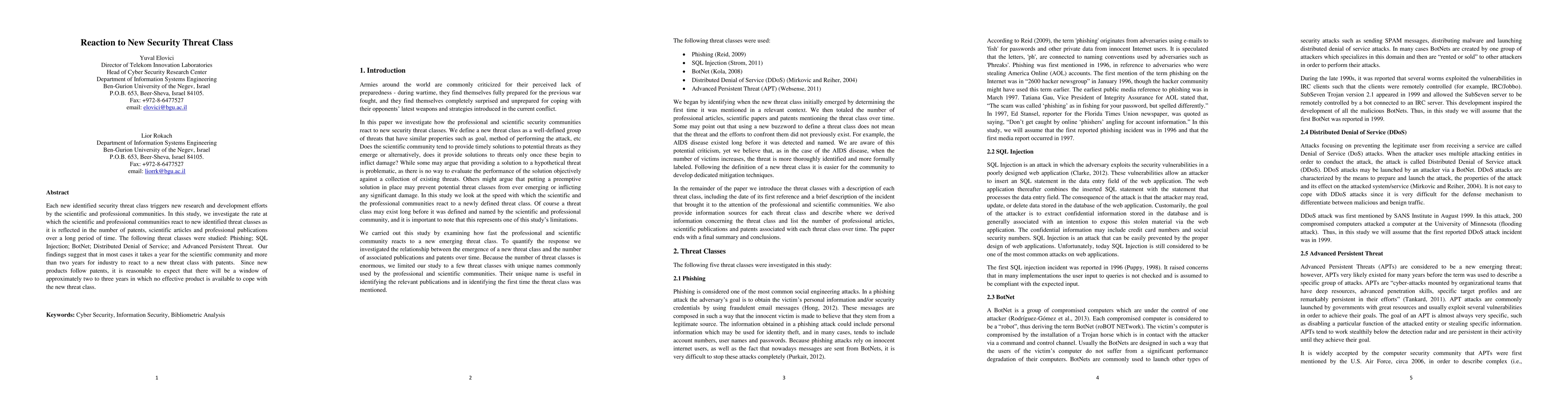 This study examines the time lag between the identification of new security threat classes and the response from the scientific and professional communities, measured by patents, scientific articles, and professional publications. It finds that the scientific community typically reacts within a year, while industry takes over two years, leading to a two to three-year gap before effective products emerge.