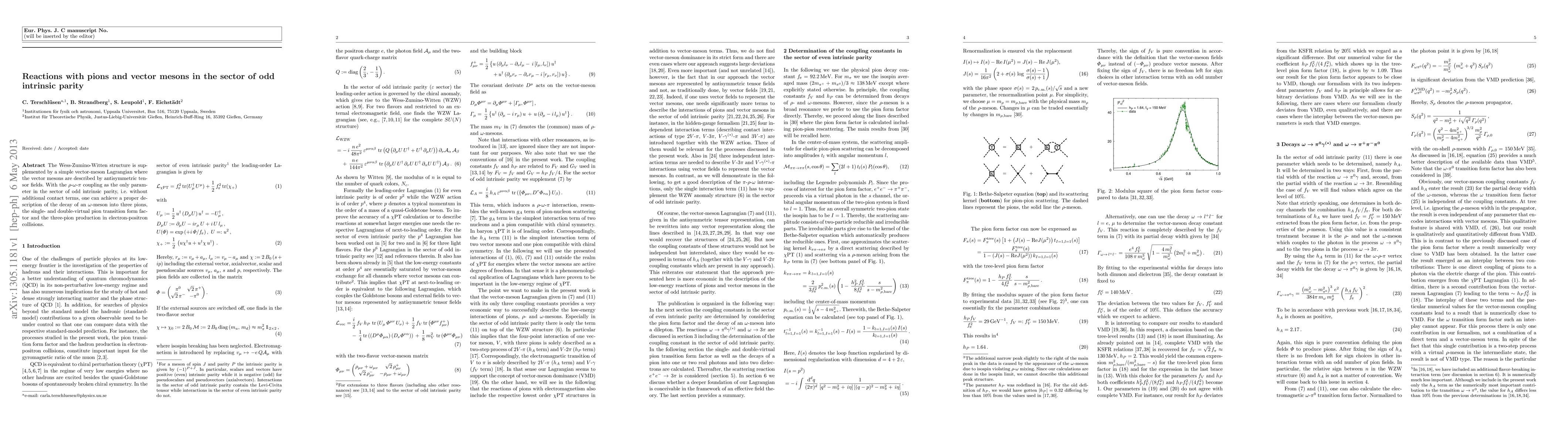 The Wess-Zumino-Witten structure is supplemented by a simple vector-meson Lagrangian where the vector mesons are described by antisymmetric tensor fields. With the \rho-\omega-\pi{} coupling as the only parameter in the sector of odd intrinsic parity, i.e. without additional contact terms, one can achieve a proper description of the decay of an \omega-meson into three pions, the single- and double-virtual pion transition form factor and the three-pion production in electron-positron collisions.