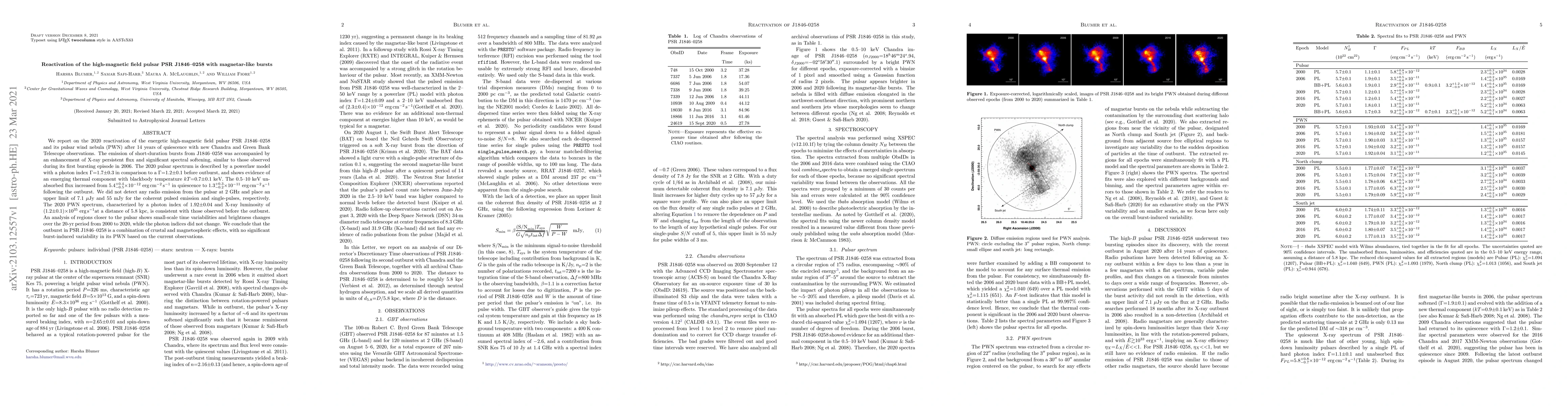 We report on the 2020 reactivation of the energetic high-magnetic field pulsar PSR J1846-0258 and its pulsar wind nebula (PWN) after 14 years of quiescence with new Chandra and Green Bank Telescope observations. The emission of short-duration bursts from J1846-0258 was accompanied by an enhancement of X-ray persistent flux and significant spectral softening, similar to those observed during its first bursting episode in 2006. The 2020 pulsar spectrum is described by a powerlaw model with a photon index Gamma=1.7\pm0.3 in comparison to a Gamma=1.2\pm0.1 before outburst and shows evidence of an emerging thermal component with blackbody temperature kT=0.7\pm0.1 keV. The 0.5--10 keV unabsorbed flux increased from 5.4e-12 erg/cm^2/s in quiescence to 1.3e-11 erg/cm^2/s following the outburst. We did not detect any radio emission from the pulsar at 2 GHz and place an upper limit of 7.1 uJy and 55 mJy for the coherent pulsed emission and single-pulses, respectively. The 2020 PWN spectrum, characterized by a photon index of 1.92\pm0.04 and X-ray luminosity of 1.2e-35 erg/s at a distance of 5.8~kpc, is consistent with those observed before the outburst. An analysis of regions closer to the pulsar shows small-scale time variabilities and brightness changes over the 20-yr period from 2000 to 2020, while the photon indices did not change. We conclude that the outburst in PSR J1846-0258 is a combination of crustal and magnetospheric effects, with no significant burst-induced variability in its PWN based on the current observations.