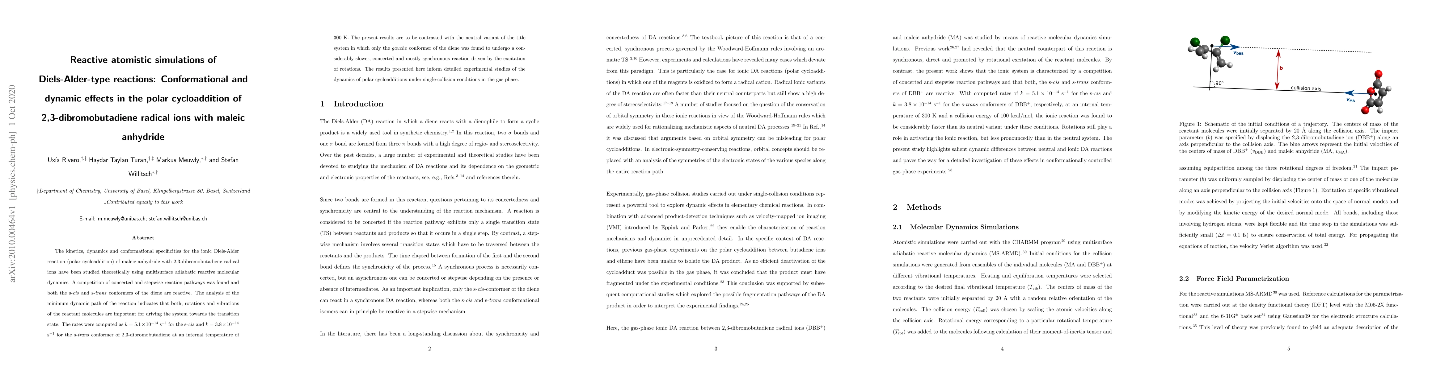 This paper investigates the kinetics and dynamics of the polar Diels-Alder reaction between maleic anhydride and 2,3-dibromobutadiene radical ions using reactive molecular dynamics. Both s-cis and s-trans conformers of the diene were found to be reactive, with computed reaction rates differing for the two conformers.