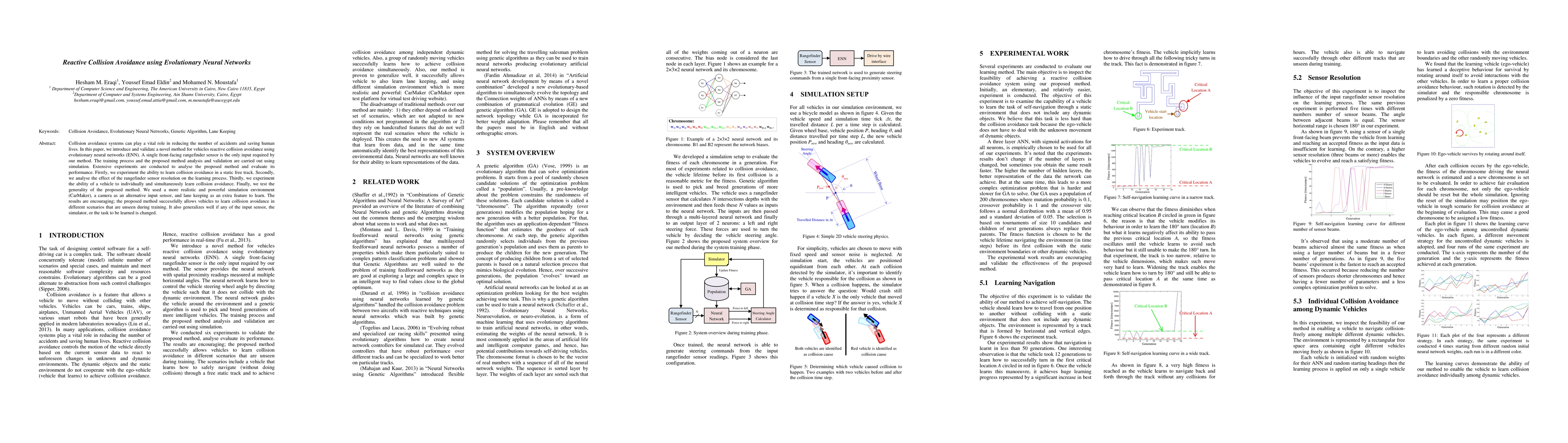 This paper proposes a novel method for reactive collision avoidance in vehicles using evolutionary neural networks, trained with a single rangefinder sensor. Simulation results show successful learning and generalization across various scenarios, including changes in sensor input and simulation environment.
