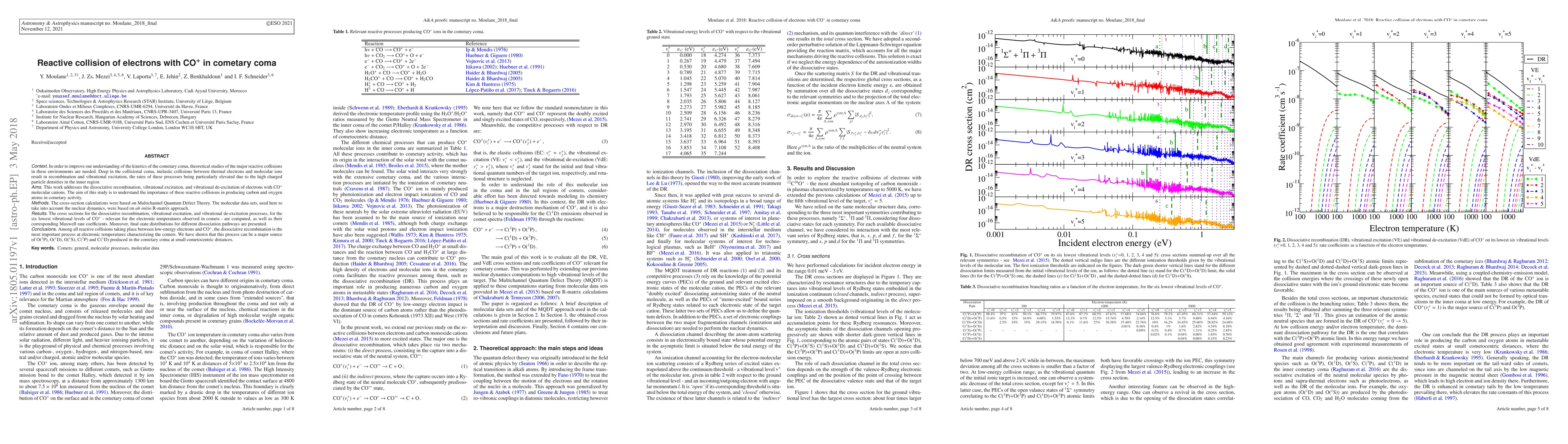 Researchers studied the collisions between electrons and CO$^+$ in cometary comas to understand how these interactions produce carbon and oxygen atoms. They found that dissociative recombination is the most important process at comet temperatures, producing key atmospheric species.