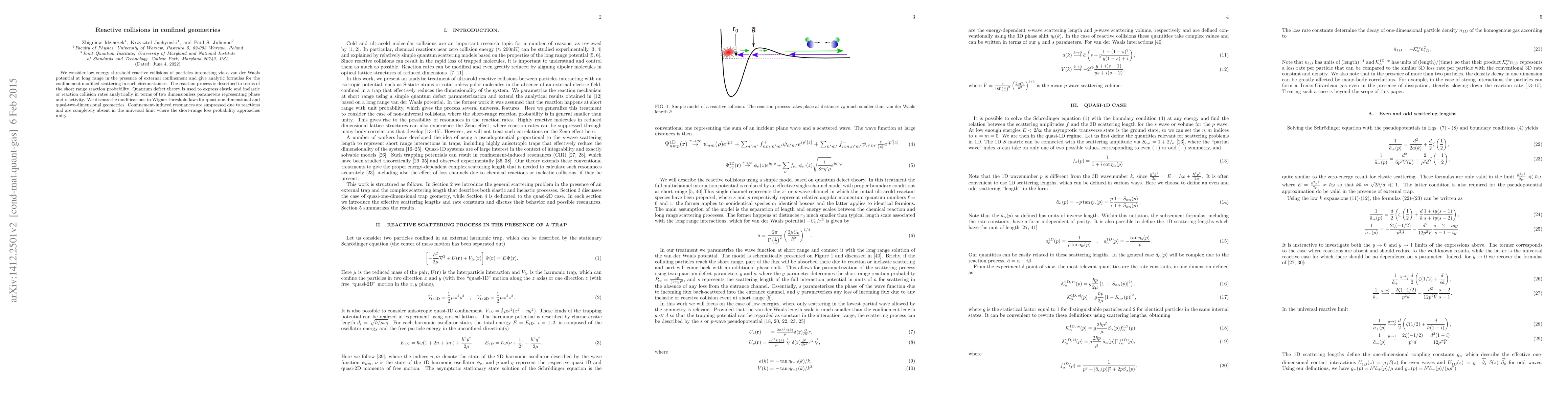 We consider low energy threshold reactive collisions of particles interacting via a van der Waals potential at long range in the presence of external confinement and give analytic formulas for the confinement modified scattering in such circumstances. The reaction process is described in terms of the short range reaction probability. Quantum defect theory is used to express elastic and inelastic or reaction collision rates analytically in terms of two dimensionless parameters representing phase and reactivity. We discuss the modifications to Wigner threshold laws for quasi-one-dimensional and quasi-two-dimensional geometries. Confinement-induced resonances are suppressed due to reactions and are completely absent in the universal limit where the short-range loss probability approaches unity.