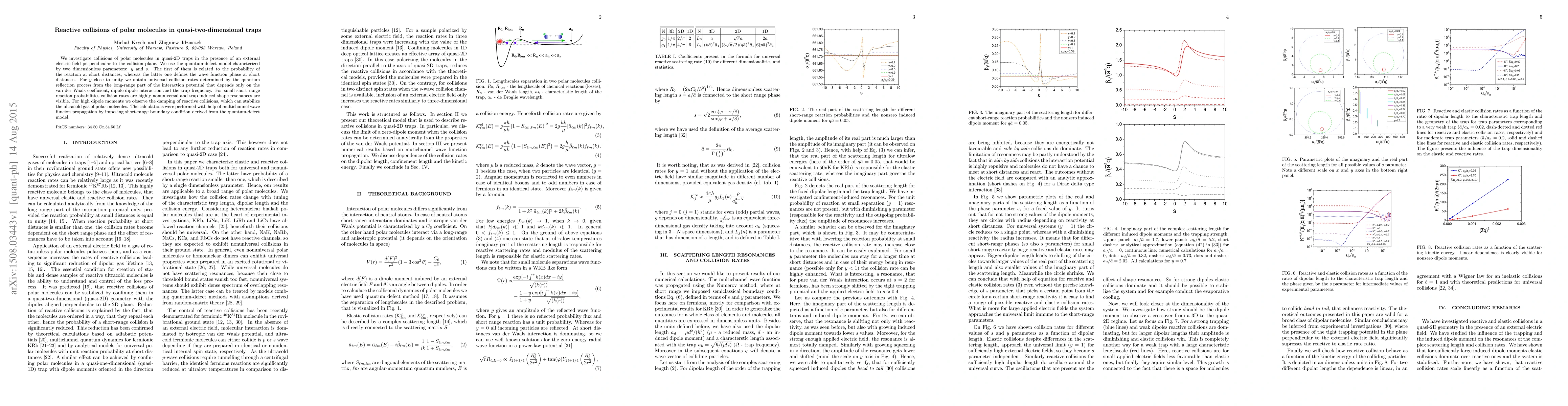 This paper studies the reactive collisions of polar molecules in quasi-two-dimensional traps under an external electric field, using a quantum-defect model. It finds universal collision rates for high reaction probabilities and nonuniversal rates with visible shape resonances for low probabilities, while high dipole moments can stabilize the gas.