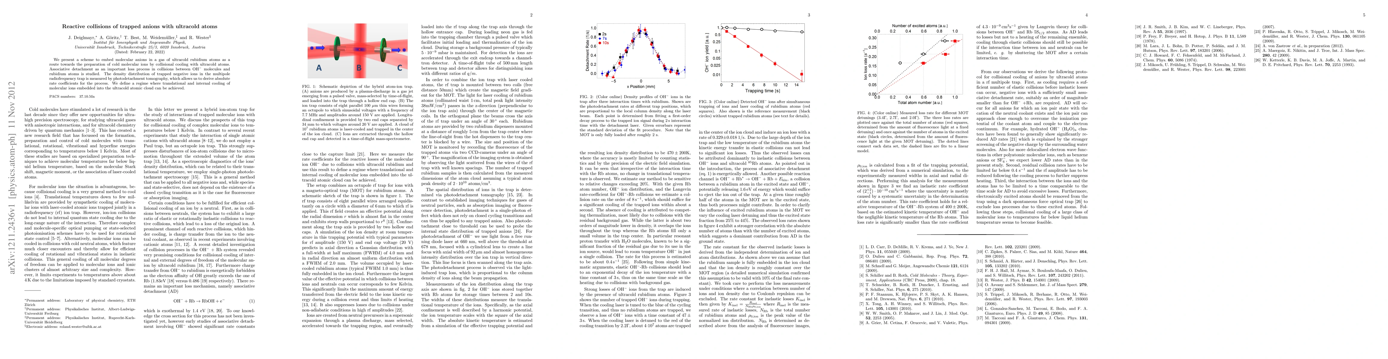 This paper proposes a method to prepare cold molecular ions by embedding molecular anions in ultracold rubidium atoms and studying their collisions, focusing on the associative detachment process between OH- and rubidium. Photodetachment tomography is used to measure the density distribution and derive absolute rate coefficients, establishing a regime for effective cooling of the trapped ions.