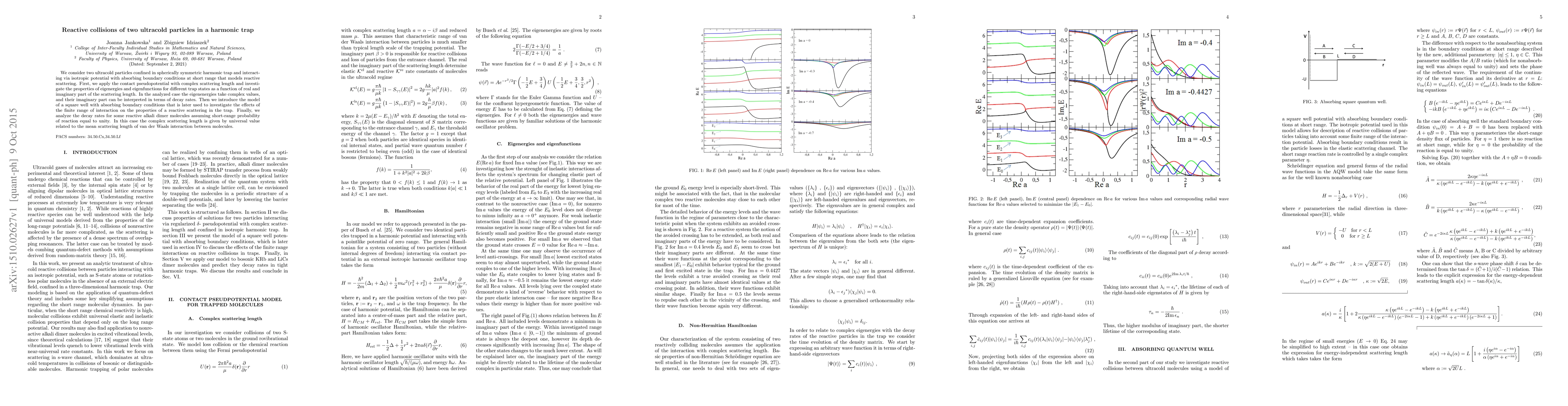 This paper investigates the reactive collisions of two ultracold particles in a harmonic trap, analyzing the effects of complex scattering lengths on eigenenergies and eigenfunctions. It employs both contact pseudopotentials and square well models to explore the decay rates and implications for reactive scattering in the trap.