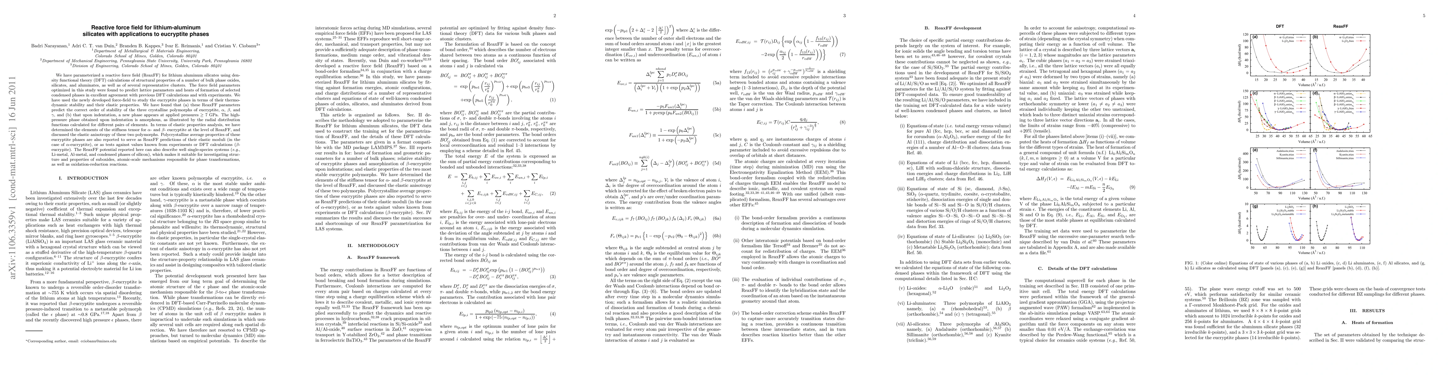 This paper develops a ReaxFF force field for lithium aluminum silicates, validated against DFT calculations and experiments, and applies it to study eucryptite phases. The force field accurately predicts the stability order of eucryptite polymorphs and reveals an amorphous high-pressure phase, along with detailed elastic properties and anisotropy analysis.