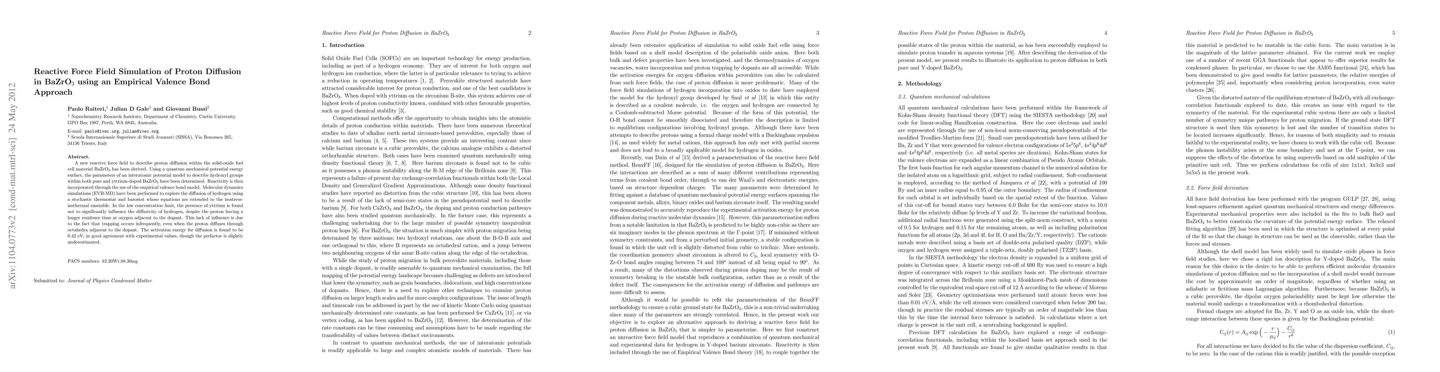 This research develops a reactive force field for proton diffusion in BaZrO3 using an empirical valence bond approach, finding that yttrium doping minimally affects hydrogen diffusivity despite longer proton residence times near dopants. The activation energy for hydrogen diffusion is 0.42 eV, closely matching experimental values.