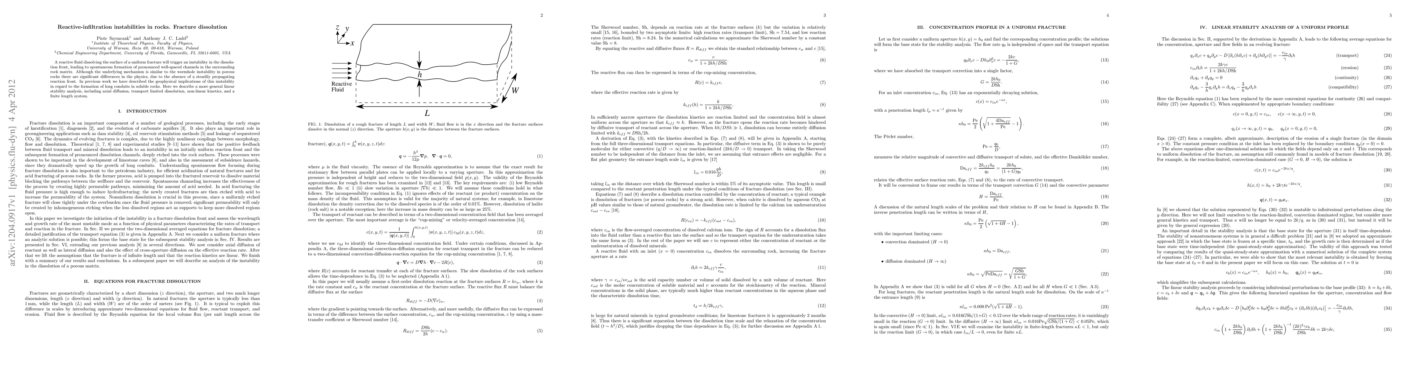 This paper investigates the reactive-infiltration instabilities that occur when a reactive fluid dissolves a uniform fracture, leading to the spontaneous formation of well-spaced channels in the rock matrix. It extends previous work by incorporating a more comprehensive linear stability analysis that includes axial diffusion, transport-limited dissolution, non-linear kinetics, and finite system length.