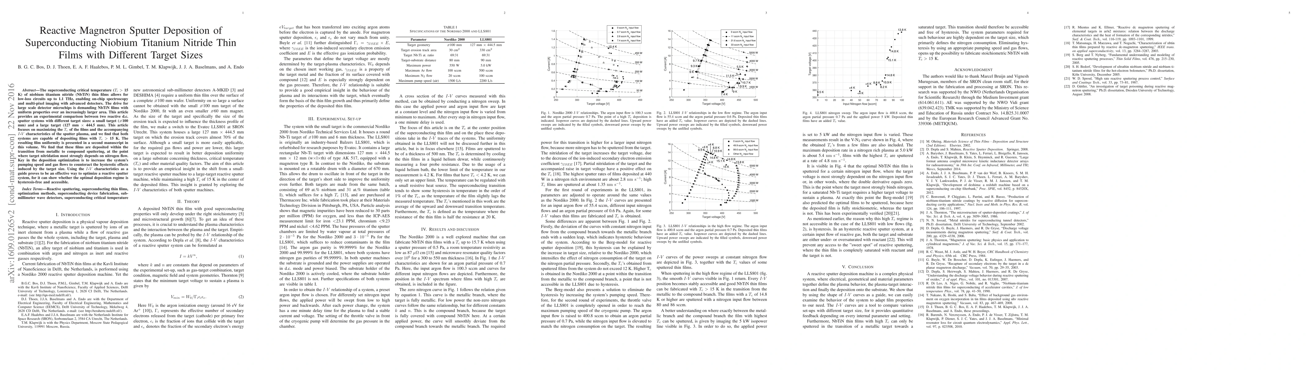 This paper investigates the deposition of superconducting niobium titanium nitride (NbTiN) thin films using reactive magnetron sputtering with different target sizes, achieving critical temperatures (Tc > 15K) for advanced low-loss circuits. The study finds both small and large target systems can deposit films with Tc > 15K, emphasizing the importance of optimizing pumping speed and gas flows to maximize film quality.