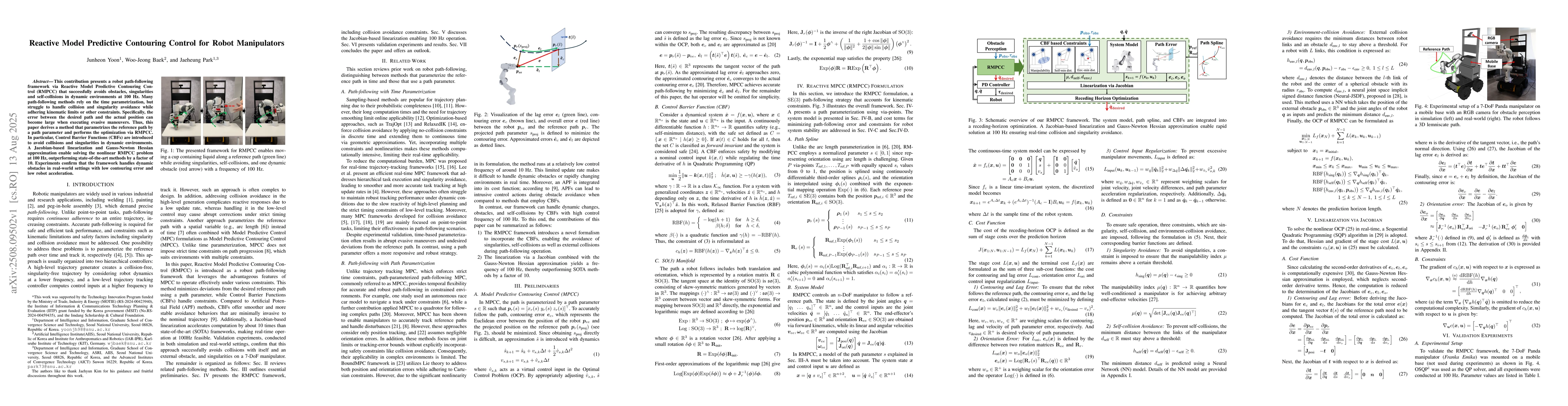 This contribution presents a robot path-following framework via Reactive Model Predictive Contouring Control (RMPCC) that successfully avoids obstacles, singularities and self-collisions in dynamic environments at 100 Hz. Many path-following methods rely on the time parametrization, but struggle to handle collision and singularity avoidance while adhering kinematic limits or other constraints. Specifically, the error between the desired path and the actual position can become large when executing evasive maneuvers. Thus, this paper derives a method that parametrizes the reference path by a path parameter and performs the optimization via RMPCC. In particular, Control Barrier Functions (CBFs) are introduced to avoid collisions and singularities in dynamic environments. A Jacobian-based linearization and Gauss-Newton Hessian approximation enable solving the nonlinear RMPCC problem at 100 Hz, outperforming state-of-the-art methods by a factor of 10. Experiments confirm that the framework handles dynamic obstacles in real-world settings with low contouring error and low robot acceleration.