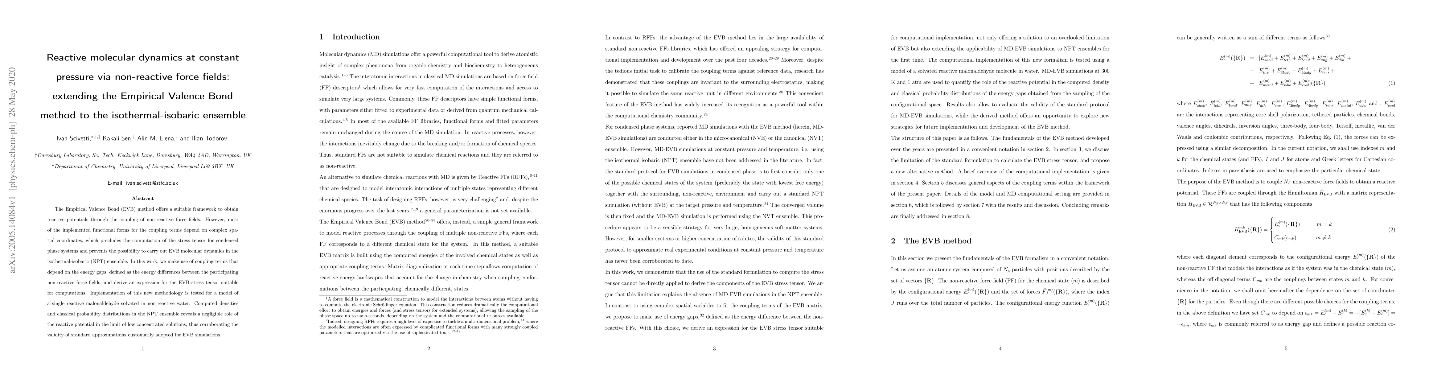 This paper extends the Empirical Valence Bond (EVB) method to enable reactive molecular dynamics in the isothermal-isobaric (NPT) ensemble by using energy gap-based coupling terms, allowing computation of the stress tensor and testing on malonaldehyde in water shows minimal reactive potential impact in dilute solutions.