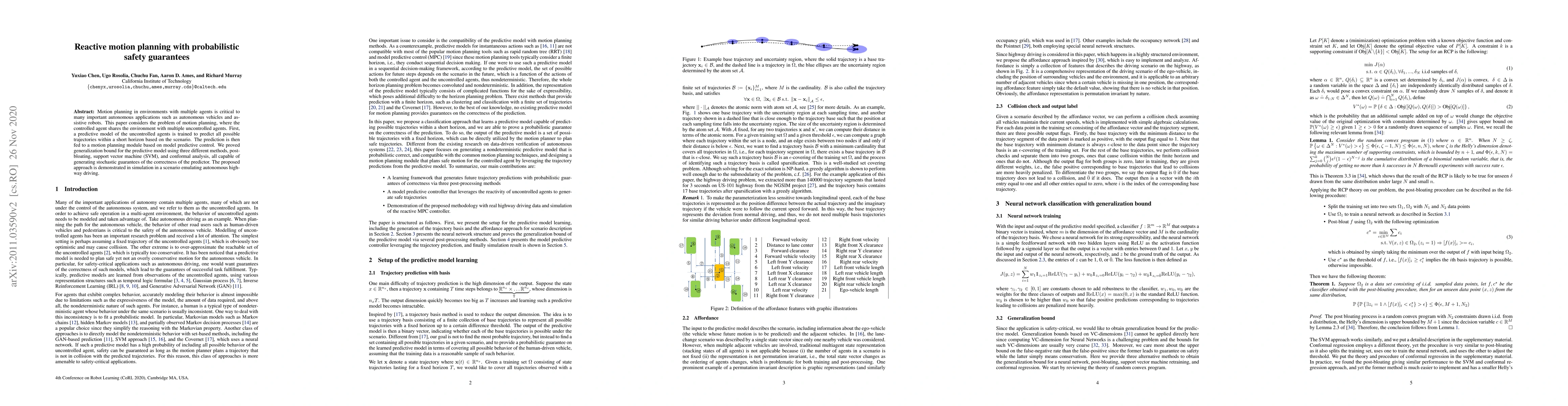 This paper develops a reactive motion planning method for autonomous agents sharing environments with multiple uncontrolled agents, using predictive models and model predictive control. It provides probabilistic safety guarantees through generalization bounds derived from post-blasting, SVM, and conformal analysis, validated via simulation in an autonomous highway scenario.