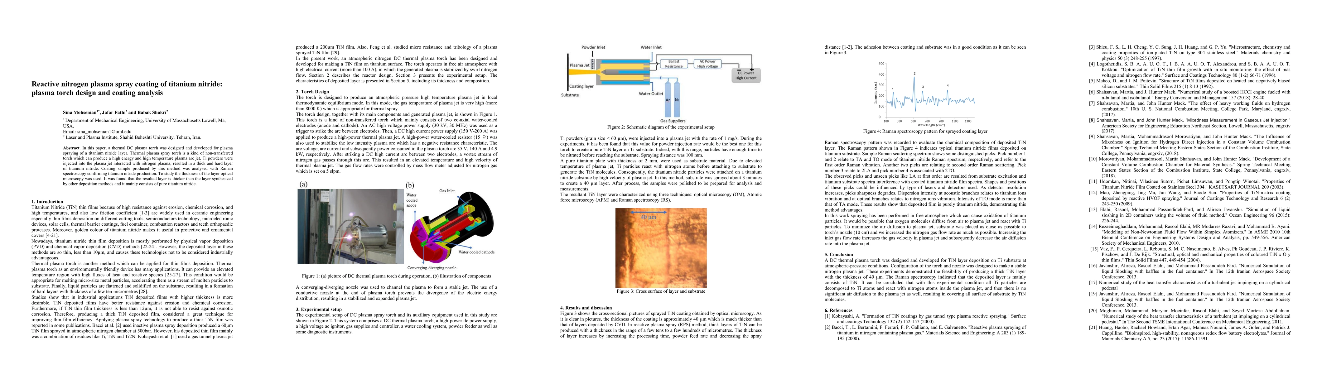 This paper details the design of a thermal DC plasma torch for depositing titanium nitride layers through reactive nitrogen plasma spraying. Analysis confirmed the production of a thick, hard titanium nitride layer, thicker than those from other methods, primarily composed of pure titanium nitride.
