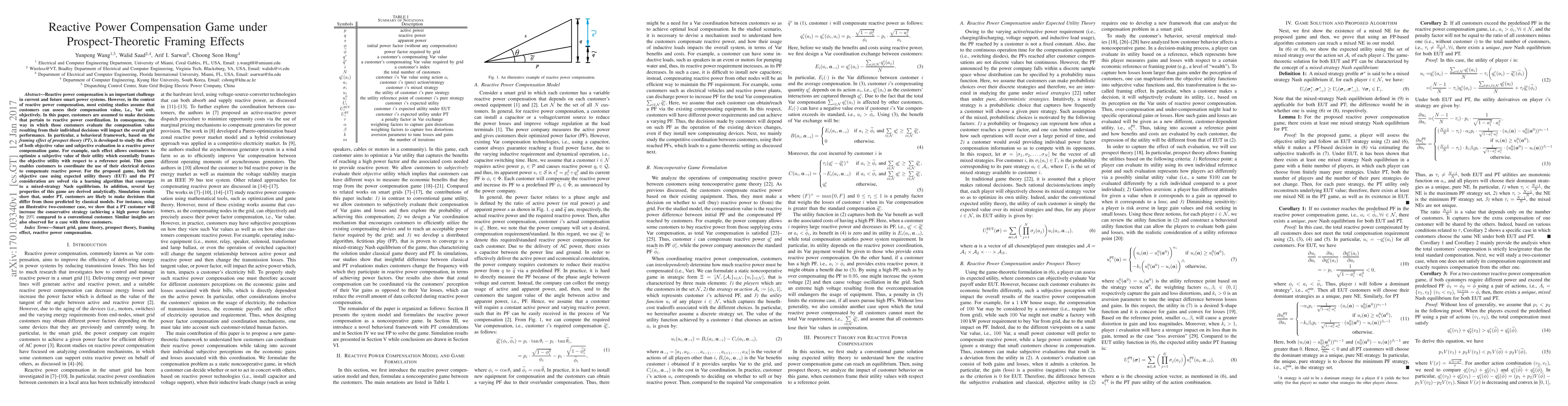 Reactive power compensation is an important challenge in current and future smart power systems. However, in the context of reactive power compensation, most existing studies assume that customers can assess their compensation value, i.e., Var unit, objectively. In this paper, customers are assumed to make decisions that pertain to reactive power coordination. In consequence, the way in which those customers evaluate the compensation value resulting from their individual decisions will impact the overall grid performance. In particular, a behavioral framework, based on the framing effect of prospect theory (PT), is developed to study the effect of both objective value and subjective evaluation in a reactive power compensation game. For example, such effect allows customers to optimize a subjective value of their utility which essentially frames the objective utility with respect to a reference point. This game enables customers to coordinate the use of their electrical devices to compensate reactive power. For the proposed game, both the objective case using expected utility theory (EUT) and the PT consideration are solved via a learning algorithm that converges to a mixed-strategy Nash equilibrium. In addition, several key properties of this game are derived analytically. Simulation results show that, under PT, customers are likely to make decisions that differ from those predicted by classical models. For instance, using an illustrative two-customer case, we show that a PT customer will increase the conservative strategy (achieving a high power factor) by 29% compared to a conventional customer. Similar insights are also observed for a case with three customers.