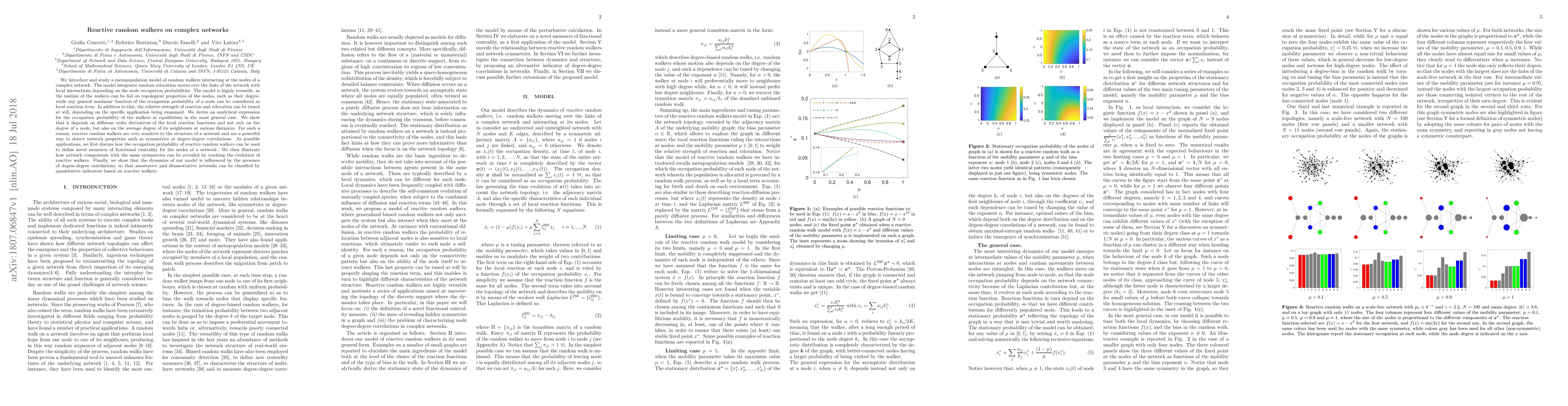 We introduce and study a metapopulation model of random walkers interacting at the nodes of a complex network. The model integrates random relocation moves over the links of the network with local interactions depending on the node occupation probabilities. The model is highly versatile, as the motion of the walkers can be fed on topological properties of the nodes, such as their degree, while any general nonlinear function of the occupation probability of a node can be considered as local reaction term. In addition to this, the relative strength of reaction and relocation can be tuned at will, depending on the specific application being examined. We derive an analytical expression for the occupation probability of the walkers at equilibrium in the most general case. We show that it depends on different order derivatives of the local reaction functions and not only on the degree of a node, but also on the average degree of its neighbours at various distances. For such a reason, reactive random walkers are very sensitive to the structure of a network and are a powerful way to detect network properties such as symmetries or degree-degree correlations. As possible applications, we first discuss how the occupation probability of reactive random walkers can be used to define novel measures of functional centrality for the nodes of a network. We then illustrate how network components with the same symmetries can be revealed by tracking the evolution of reactive walkers. Finally, we show that the dynamics of our model is influenced by the presence of degree-degree correlations, so that assortative and disassortative networks can be classified by quantitative indicators based on reactive walkers.