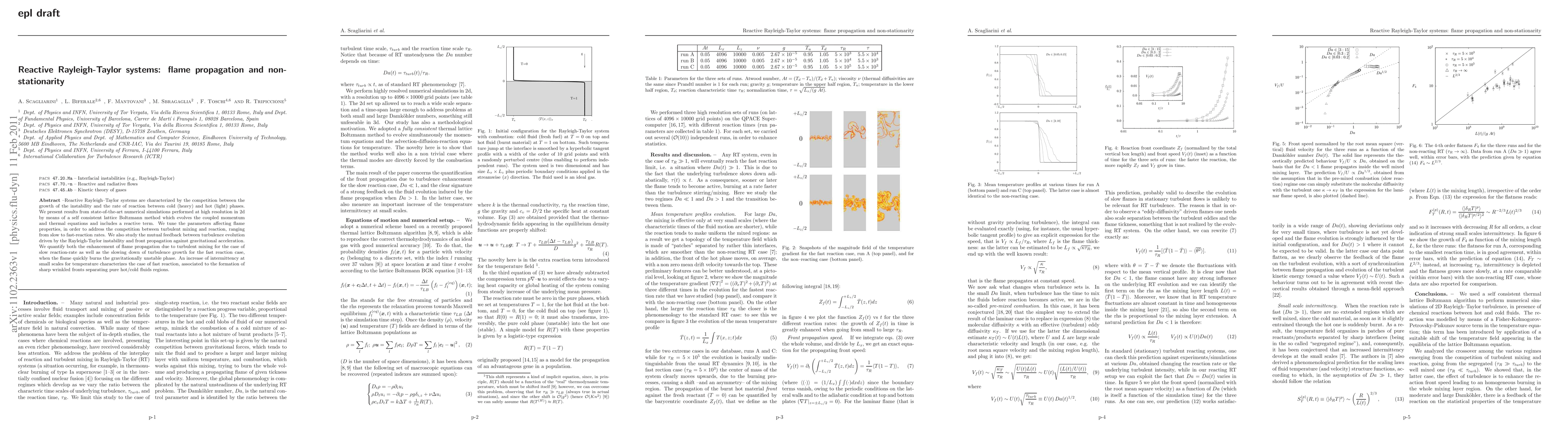 Reactive Rayleigh-Taylor systems are characterized by the competition between the growth of the instability and the rate of reaction between cold (heavy) and hot (light) phases. We present results from state-of-the-art numerical simulations performed at high resolution in 2d by means of a self-consistent lattice Boltzmann method which evolves the coupled momentum and thermal equations and includes a reactive term. We tune the parameters affecting flame properties, in order to address the competition between turbulent mixing and reaction, ranging from slow to fast-reaction rates. We also study the mutual feedback between turbulence evolution driven by the Rayleigh-Taylor instability and front propagation against gravitational acceleration. We quantify both the enhancement of flame propagation due to turbulent mixing for the case of slow reaction-rate as well as the slowing down of turbulence growth for the fast reaction case, when the flame quickly burns the gravitationally unstable phase. An increase of intermittency at small scales for temperature characterizes the case of fast reaction, associated to the formation of sharp wrinkled fronts separating pure hot/cold fluids regions.