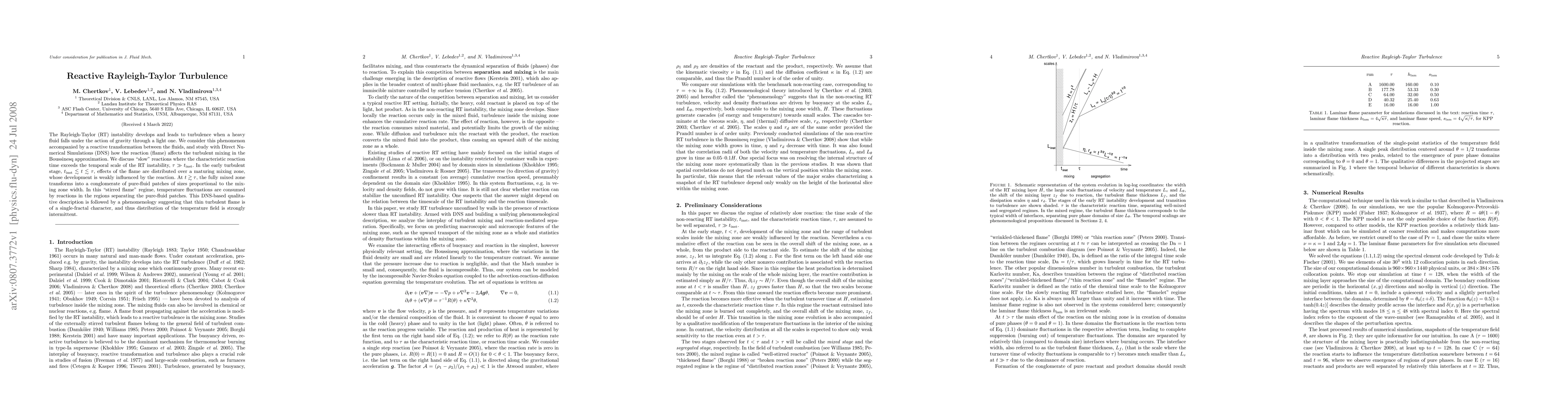 The Rayleigh-Taylor (RT) instability develops and leads to turbulence when a heavy fluid falls under the action of gravity through a light one. We consider this phenomenon accompanied by a reactive transformation between the fluids, and study with Direct Numerical Simulations (DNS) how the reaction (flame) affects the turbulent mixing in the Boussinesq approximation. We discuss "slow" reactions where the characteristic reaction time exceeds the temporal scale of the RT instability. In the early turbulent stage, effects of the flame are distributed over a maturing mixing zone, whose development is weakly influenced by the reaction. At later times, the fully mixed zone transforms into a conglomerate of pure-fluid patches of sizes proportional to the mixing zone width. In this "stirred flame'' regime, temperature fluctuations are consumed by reactions in the regions separating the pure-fluid patches. This DNS-based qualitative description is followed by a phenomenology suggesting that thin turbulent flame is of a single-fractal character, and thus distribution of the temperature field is strongly intermittent.