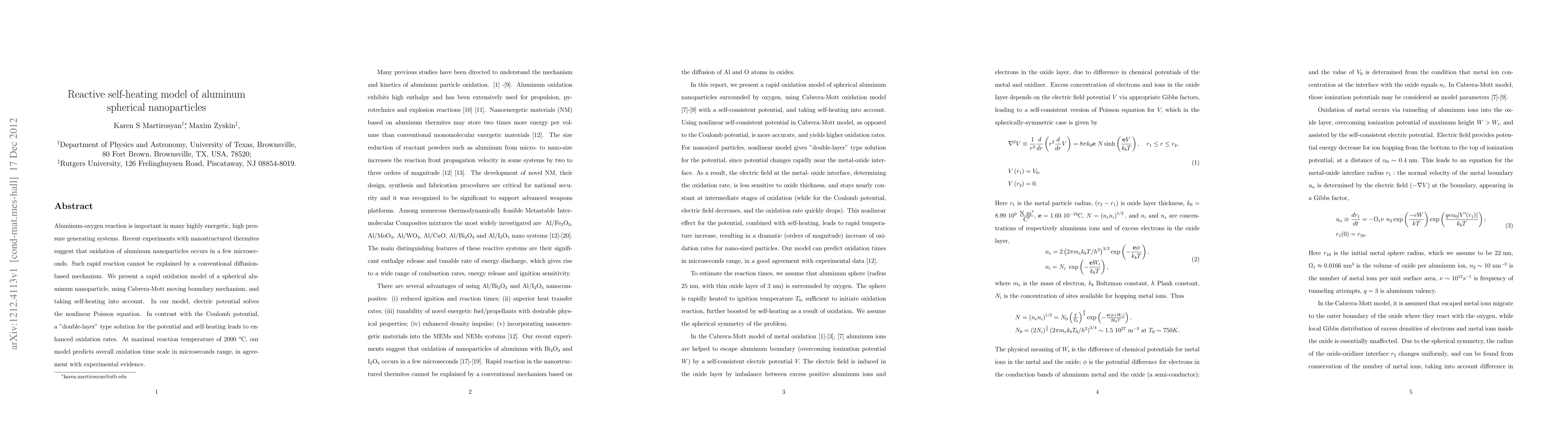 Aluminum-oxygen reaction is important in many highly energetic, high pressure generating systems. Recent experiments with nanostructured thermites suggest that oxidation of aluminum nanoparticles occurs in a few microseconds. Such rapid reaction cannot be explained by a conventional diffusion-based mechanism. We present a rapid oxidation model of a spherical aluminum nanoparticle, using Cabrera-Mott moving boundary mechanism, and taking self-heating into account. In our model, electric potential solves the nonlinear Poisson equation. In contrast with the Coulomb potential, a "double-layer" type solution for the potential and self-heating leads to enhanced oxidation rates. At maximal reaction temperature of 2000 C, our model predicts overall oxidation time scale in microseconds range, in agreement with experimental evidence.