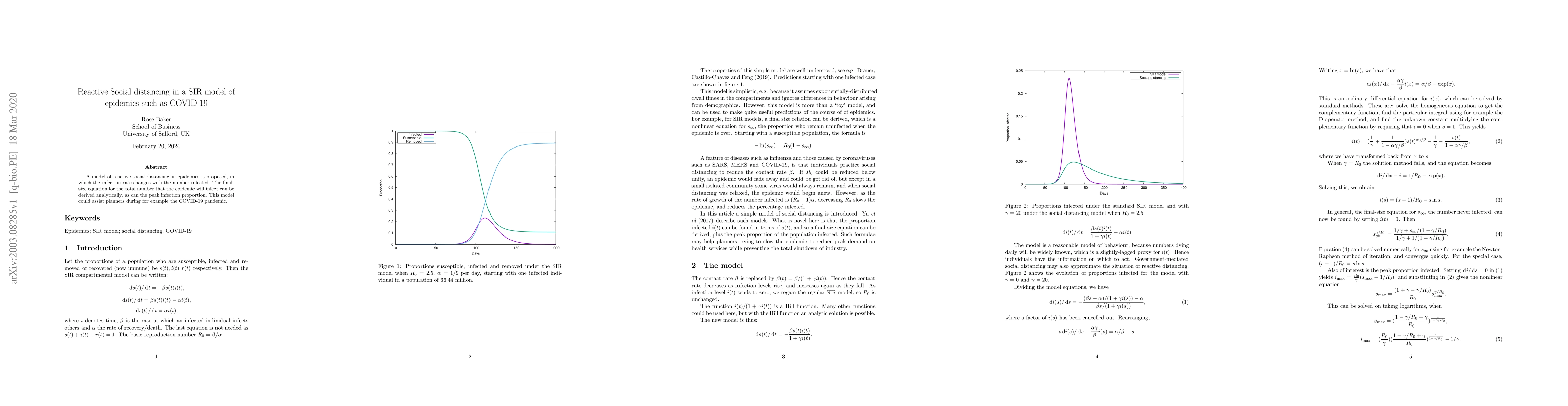 A model of reactive social distancing in epidemics is proposed, in which the infection rate changes with the number infected. The final-size equation for the total number that the epidemic will infect can be derived analytically, as can the peak infection proportion. This model could assist planners during for example the COVID-19 pandemic.