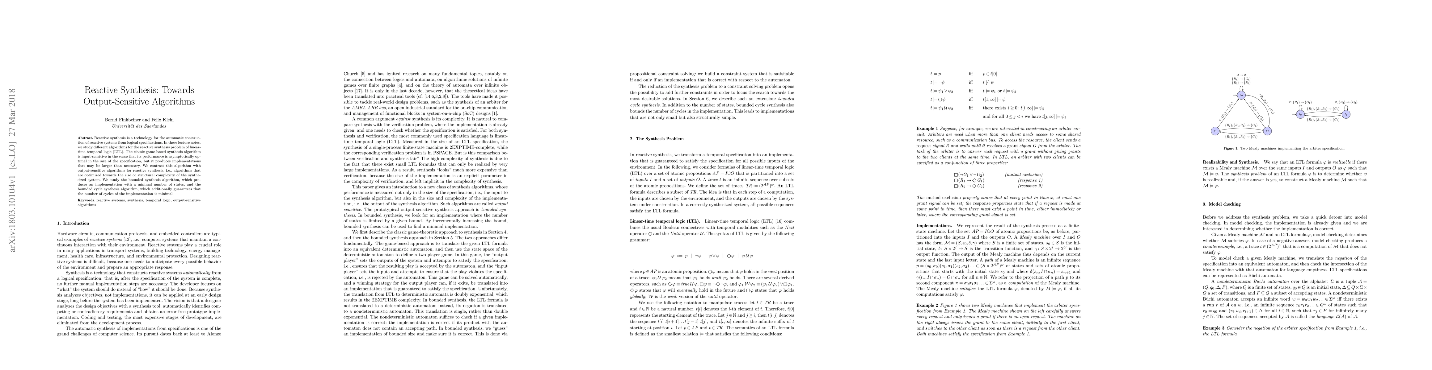 This paper explores reactive synthesis algorithms for constructing reactive systems from logical specifications, focusing on output-sensitive approaches that optimize for minimal system size and complexity. It contrasts input-sensitive game-based algorithms with output-sensitive methods, including bounded synthesis and bounded cycle synthesis for minimal state and cycle counts.
