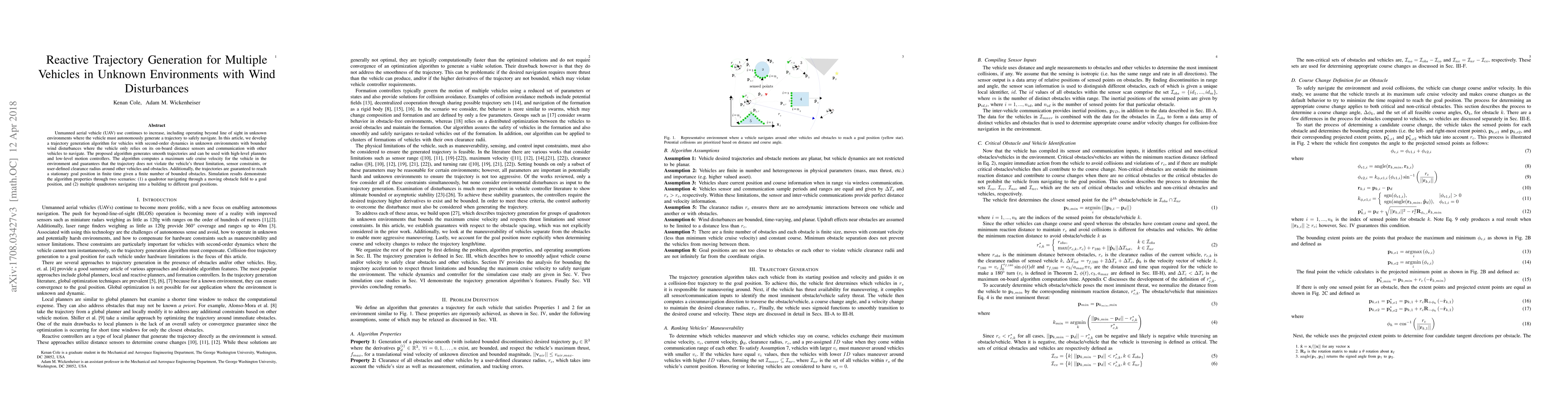 Unmanned aerial vehicle (UAV) use continues to increase, including operating beyond line of sight in unknown environments where the vehicle must autonomously generate a trajectory to safely navigate. In this article, we develop a trajectory generation algorithm for vehicles with second-order dynamics in unknown environments with bounded wind disturbances where the vehicle only relies on its on-board distance sensors and communication with other vehicles to navigate. The proposed algorithm generates smooth trajectories and can be used with high-level planners and low-level motion controllers. The algorithm computes a maximum safe cruise velocity for the vehicle in the environment and guarantees that the trajectory does not violate the vehicle's thrust limitation, sensor constraints, or user-defined clearance radius around other vehicles and obstacles. Additionally, the trajectories are guaranteed to reach a stationary goal position in finite time given a finite number of bounded obstacles. Simulation results demonstrate the algorithm properties through two scenarios: (1) a quadrotor navigating through a moving obstacle field to a goal position, and (2) multiple quadrotors navigating into a building to different goal positions.