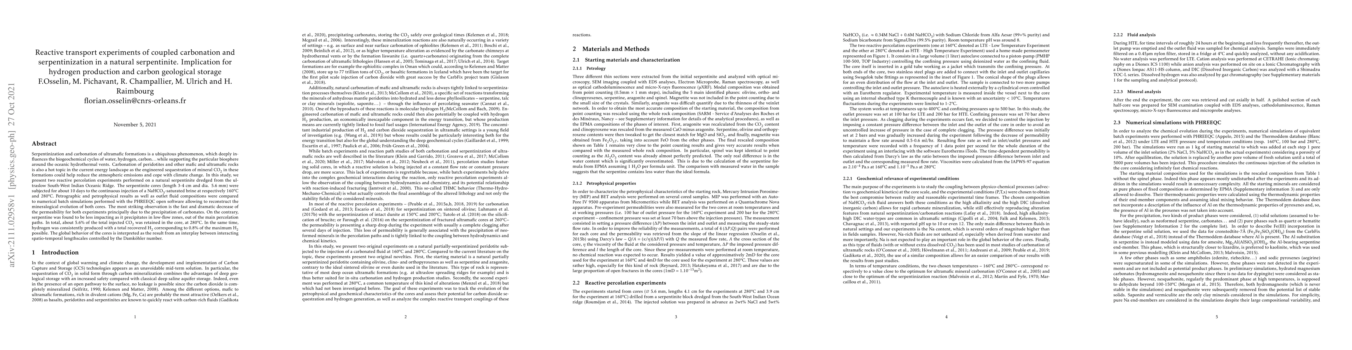 This study investigates the reactive transport of carbonation and serpentinization in natural serpentinite, focusing on hydrogen production and carbon sequestration. Experiments at 160°C and 280°C showed significant permeability reduction due to carbonate precipitation, while serpentine had minimal impact. Approximately 5.6% of CO2 was retained, and 0.8% of maximum possible hydrogen was produced, highlighting the interplay between reaction rates and transport processes.