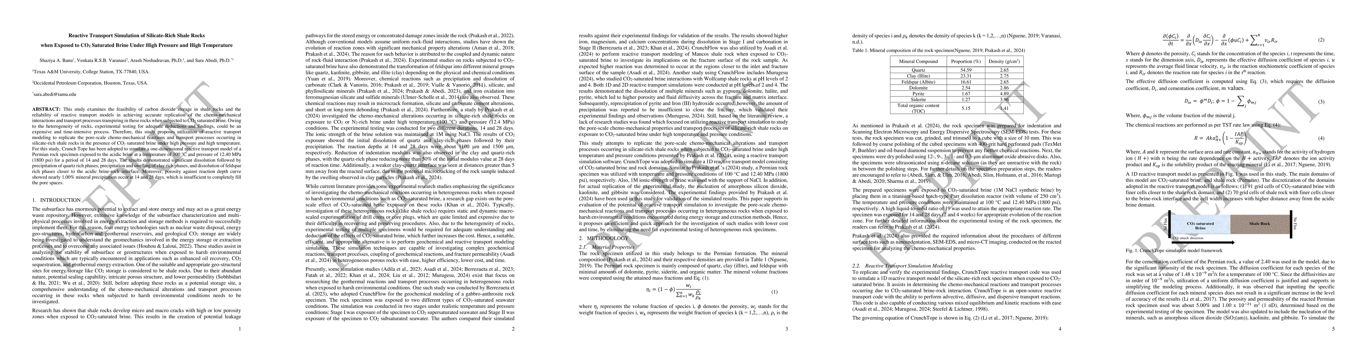 The research employs a one-dimensional reactive transport model using Crunch Tope to simulate a Permian rock specimen's response to CO2 saturated brine at 100°C and 12.40 MPa pressure for 14 and 28 days.