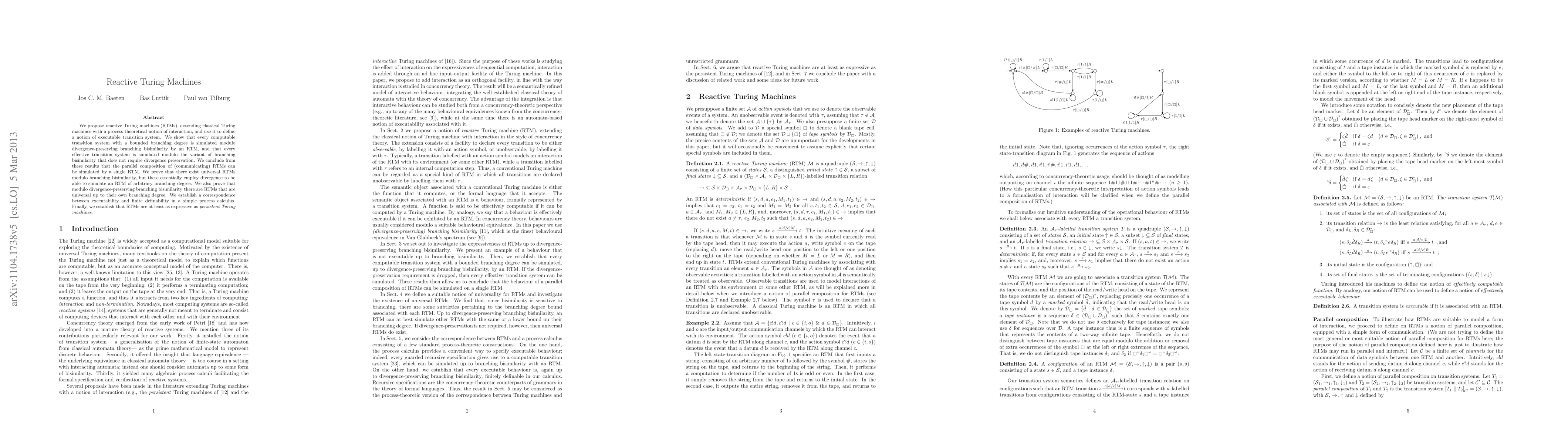 Reactive Turing machines (RTMs) extend classical Turing machines to include interaction, enabling the definition of executable transition systems. The paper demonstrates that RTMs can simulate computable transition systems while preserving branching behavior, and establishes the existence of universal RTMs for both general and divergence-preserving simulations.
