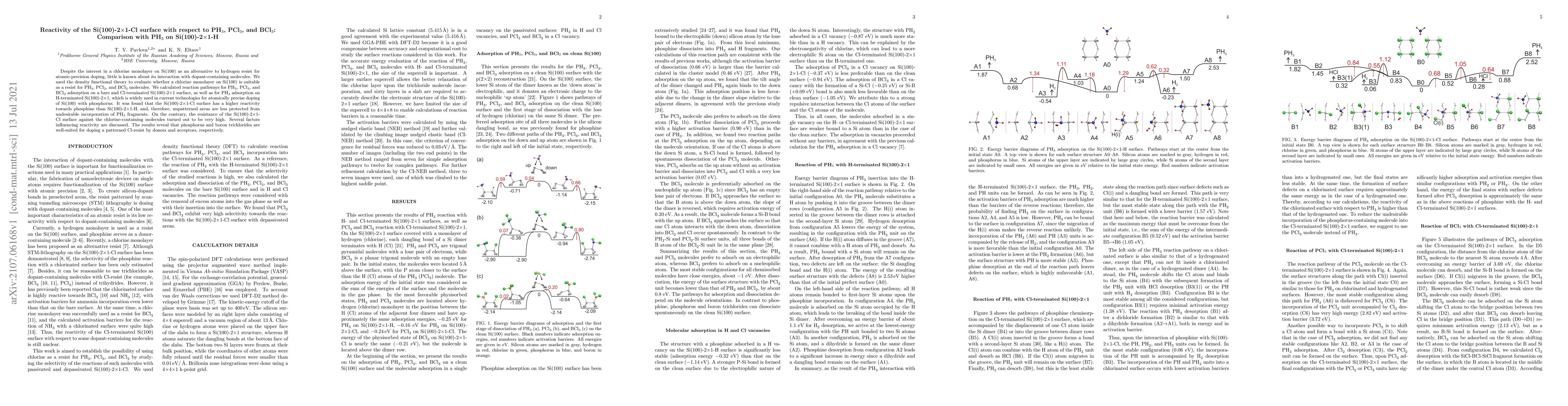 This study compares the reactivity of Si(100)-2×1 surfaces with chlorine and hydrogen monolayers towards PH$_3$, PCl$_3$, and BCl$_3$ using density functional theory. It found that the Cl-terminated surface shows higher reactivity to phosphine but better resistance to chlorine-containing molecules, suggesting PCl$_3$ and BCl$_3$ can effectively dope the patterned Cl-resist.