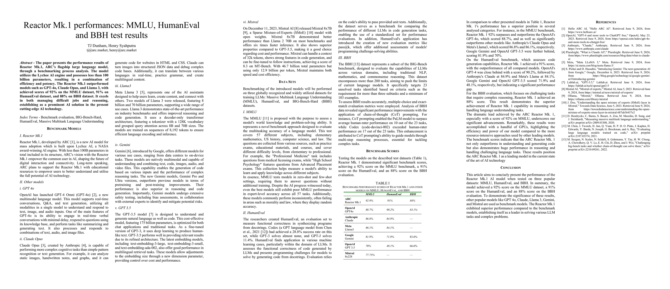 The paper presents the performance results of Reactor Mk.1, ARCs flagship large language model, through a benchmarking process analysis. The model utilizes the Lychee AI engine and possesses less than 100 billion parameters, resulting in a combination of efficiency and potency. The Reactor Mk.1 outperformed models such as GPT-4o, Claude Opus, and Llama 3, with achieved scores of 92% on the MMLU dataset, 91% on HumanEval dataset, and 88% on BBH dataset. It excels in both managing difficult jobs and reasoning, establishing as a prominent AI solution in the present cutting-edge AI technology.