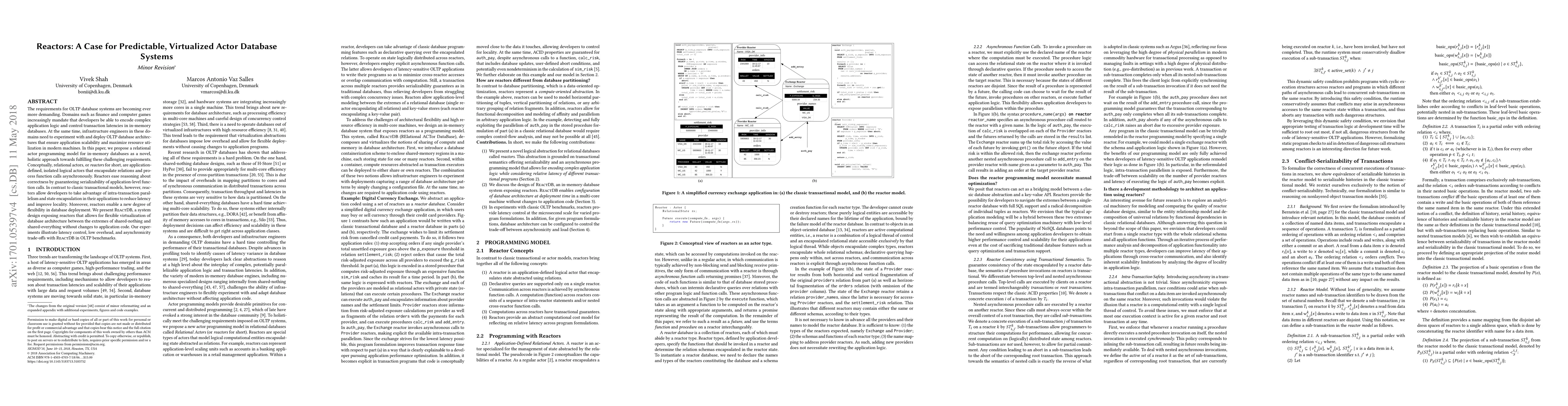 This paper proposes a relational actor programming model called reactors for in-memory databases to meet demanding OLTP requirements, offering flexibility in deployment and enabling intra-transaction parallelism. ReactDB, the system designed around reactors, allows for flexible virtualization of database architecture with low overhead and controlled latency.