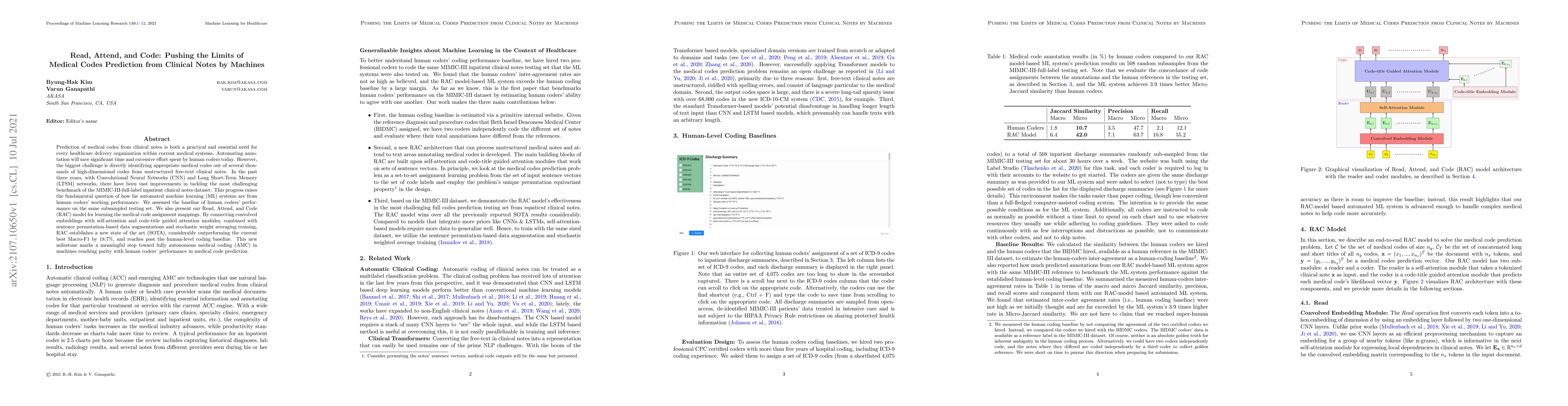 Prediction of medical codes from clinical notes is both a practical and essential need for every healthcare delivery organization within current medical systems. Automating annotation will save significant time and excessive effort spent by human coders today. However, the biggest challenge is directly identifying appropriate medical codes out of several thousands of high-dimensional codes from unstructured free-text clinical notes. In the past three years, with Convolutional Neural Networks (CNN) and Long Short-Term Memory (LTSM) networks, there have been vast improvements in tackling the most challenging benchmark of the MIMIC-III-full-label inpatient clinical notes dataset. This progress raises the fundamental question of how far automated machine learning (ML) systems are from human coders' working performance. We assessed the baseline of human coders' performance on the same subsampled testing set. We also present our Read, Attend, and Code (RAC) model for learning the medical code assignment mappings. By connecting convolved embeddings with self-attention and code-title guided attention modules, combined with sentence permutation-based data augmentations and stochastic weight averaging training, RAC establishes a new state of the art (SOTA), considerably outperforming the current best Macro-F1 by 18.7%, and reaches past the human-level coding baseline. This new milestone marks a meaningful step toward fully autonomous medical coding (AMC) in machines reaching parity with human coders' performance in medical code prediction.