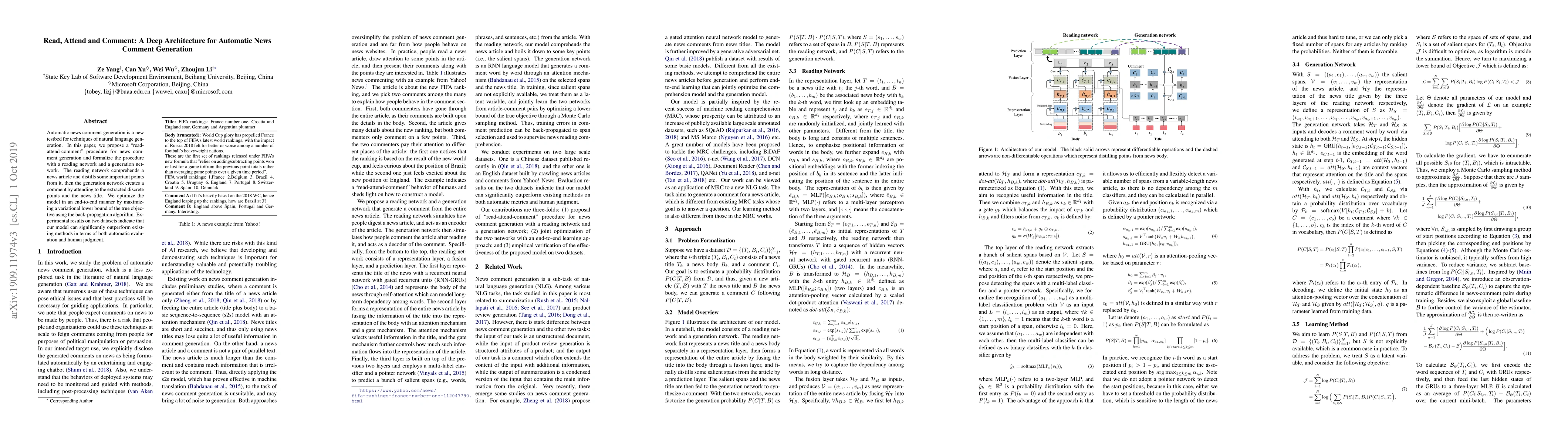 A new method for generating automatic news comments, called 'read-attend-comment', uses a reading network to extract important points from an article and a generation network to create a comment, achieving significant outperformance over existing methods.