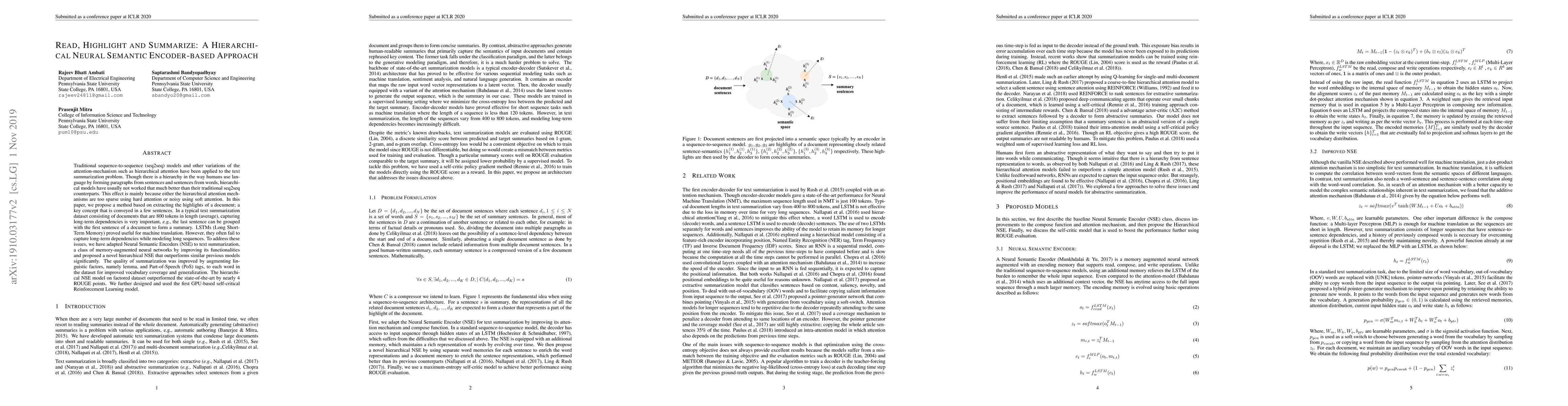 Traditional sequence-to-sequence (seq2seq) models and other variations of the attention-mechanism such as hierarchical attention have been applied to the text summarization problem. Though there is a hierarchy in the way humans use language by forming paragraphs from sentences and sentences from words, hierarchical models have usually not worked that much better than their traditional seq2seq counterparts. This effect is mainly because either the hierarchical attention mechanisms are too sparse using hard attention or noisy using soft attention. In this paper, we propose a method based on extracting the highlights of a document; a key concept that is conveyed in a few sentences. In a typical text summarization dataset consisting of documents that are 800 tokens in length (average), capturing long-term dependencies is very important, e.g., the last sentence can be grouped with the first sentence of a document to form a summary. LSTMs (Long Short-Term Memory) proved useful for machine translation. However, they often fail to capture long-term dependencies while modeling long sequences. To address these issues, we have adapted Neural Semantic Encoders (NSE) to text summarization, a class of memory-augmented neural networks by improving its functionalities and proposed a novel hierarchical NSE that outperforms similar previous models significantly. The quality of summarization was improved by augmenting linguistic factors, namely lemma, and Part-of-Speech (PoS) tags, to each word in the dataset for improved vocabulary coverage and generalization. The hierarchical NSE model on factored dataset outperformed the state-of-the-art by nearly 4 ROUGE points. We further designed and used the first GPU-based self-critical Reinforcement Learning model.