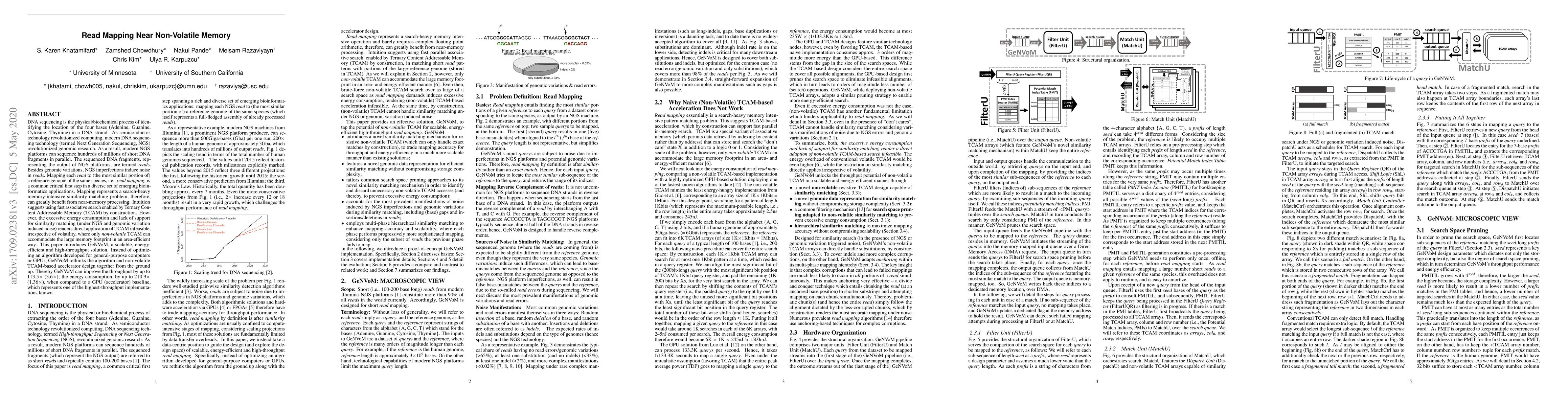 DNA sequencing is the physical/biochemical process of identifying the location of the four bases (Adenine, Guanine, Cytosine, Thymine) in a DNA strand. As semiconductor technology revolutionized computing, modern DNA sequencing technology (termed Next Generation Sequencing, NGS)revolutionized genomic research. As a result, modern NGS platforms can sequence hundreds of millions of short DNA fragments in parallel. The sequenced DNA fragments, representing the output of NGS platforms, are termed reads. Besides genomic variations, NGS imperfections induce noise in reads. Mapping each read to (the most similar portion of) a reference genome of the same species, i.e., read mapping, is a common critical first step in a diverse set of emerging bioinformatics applications. Mapping represents a search-heavy memory-intensive similarity matching problem, therefore, can greatly benefit from near-memory processing. Intuition suggests using fast associative search enabled by Ternary Content Addressable Memory (TCAM) by construction. However, the excessive energy consumption and lack of support for similarity matching (under NGS and genomic variation induced noise) renders direct application of TCAM infeasible, irrespective of volatility, where only non-volatile TCAM can accommodate the large memory footprint in an area-efficient way. This paper introduces GeNVoM, a scalable, energy-efficient and high-throughput solution. Instead of optimizing an algorithm developed for general-purpose computers or GPUs, GeNVoM rethinks the algorithm and non-volatile TCAM-based accelerator design together from the ground up. Thereby GeNVoM can improve the throughput by up to 113.5 times (3.6); the energy consumption, by up to 210.9 times (1.36), when compared to a GPU (accelerator) baseline, which represents one of the highest-throughput implementations known.