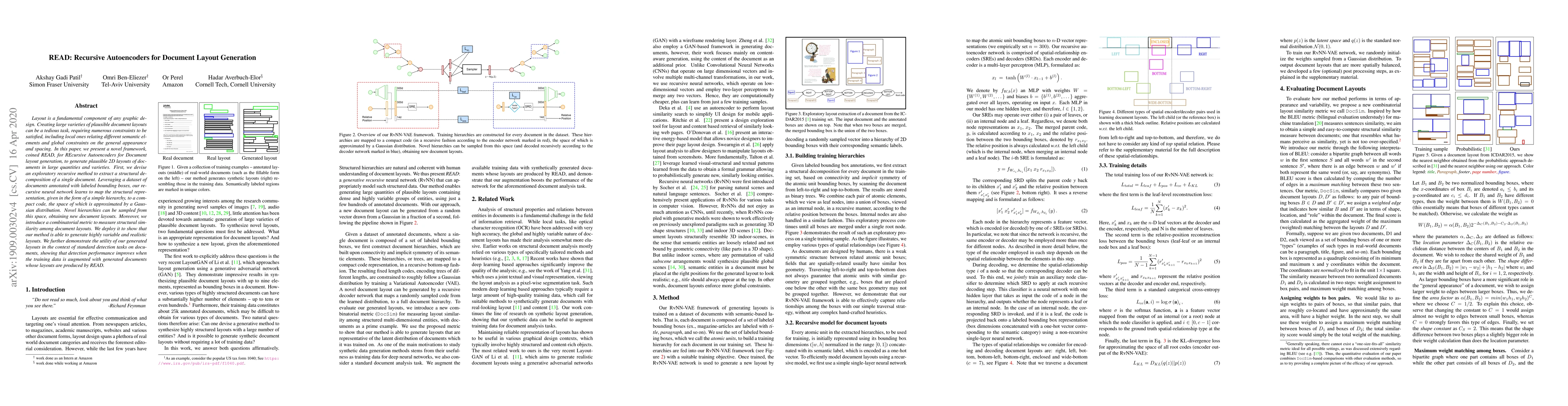 Layout is a fundamental component of any graphic design. Creating large varieties of plausible document layouts can be a tedious task, requiring numerous constraints to be satisfied, including local ones relating different semantic elements and global constraints on the general appearance and spacing. In this paper, we present a novel framework, coined READ, for REcursive Autoencoders for Document layout generation, to generate plausible 2D layouts of documents in large quantities and varieties. First, we devise an exploratory recursive method to extract a structural decomposition of a single document. Leveraging a dataset of documents annotated with labeled bounding boxes, our recursive neural network learns to map the structural representation, given in the form of a simple hierarchy, to a compact code, the space of which is approximated by a Gaussian distribution. Novel hierarchies can be sampled from this space, obtaining new document layouts. Moreover, we introduce a combinatorial metric to measure structural similarity among document layouts. We deploy it to show that our method is able to generate highly variable and realistic layouts. We further demonstrate the utility of our generated layouts in the context of standard detection tasks on documents, showing that detection performance improves when the training data is augmented with generated documents whose layouts are produced by READ.