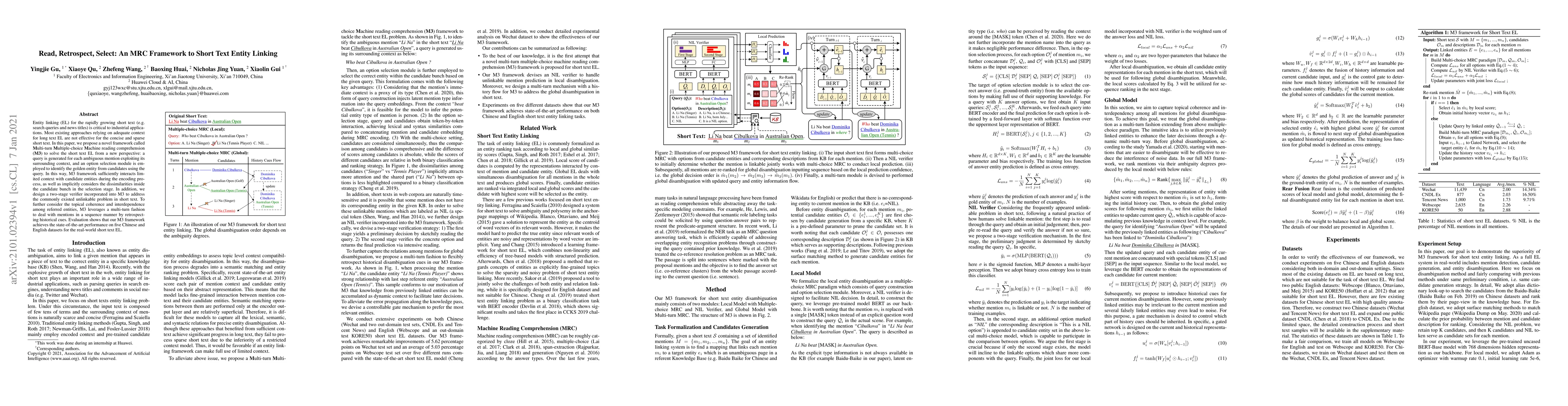 This paper proposes a novel framework called M3 to solve short text entity linking, achieving state-of-the-art performance on Chinese and English datasets, by leveraging query generation and multi-turn machine reading comprehension with retrospective historical cues.