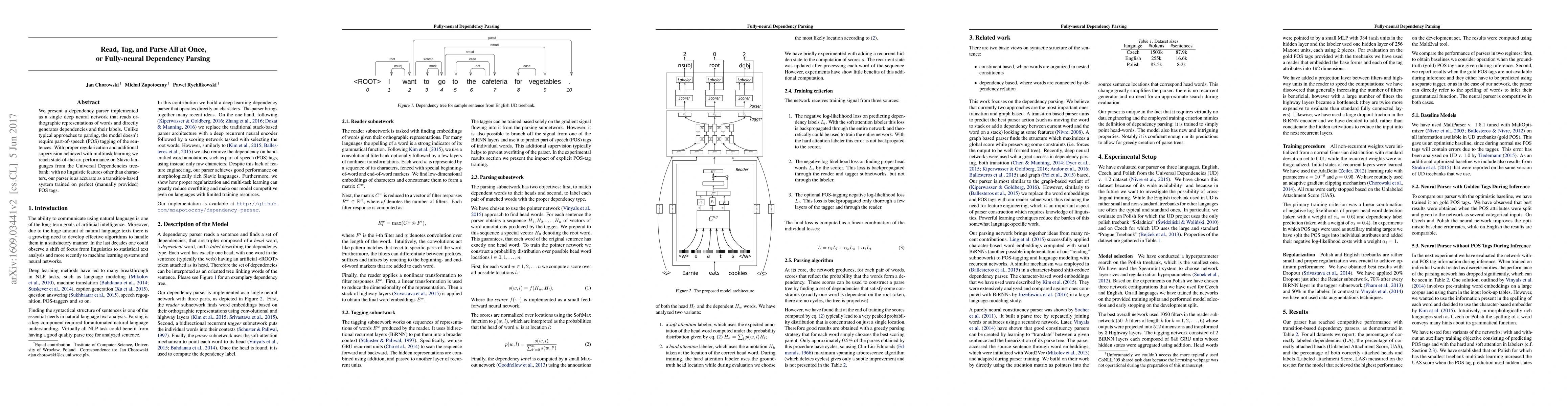 We present a dependency parser implemented as a single deep neural network that reads orthographic representations of words and directly generates dependencies and their labels. Unlike typical approaches to parsing, the model doesn't require part-of-speech (POS) tagging of the sentences. With proper regularization and additional supervision achieved with multitask learning we reach state-of-the-art performance on Slavic languages from the Universal Dependencies treebank: with no linguistic features other than characters, our parser is as accurate as a transition- based system trained on perfect POS tags.