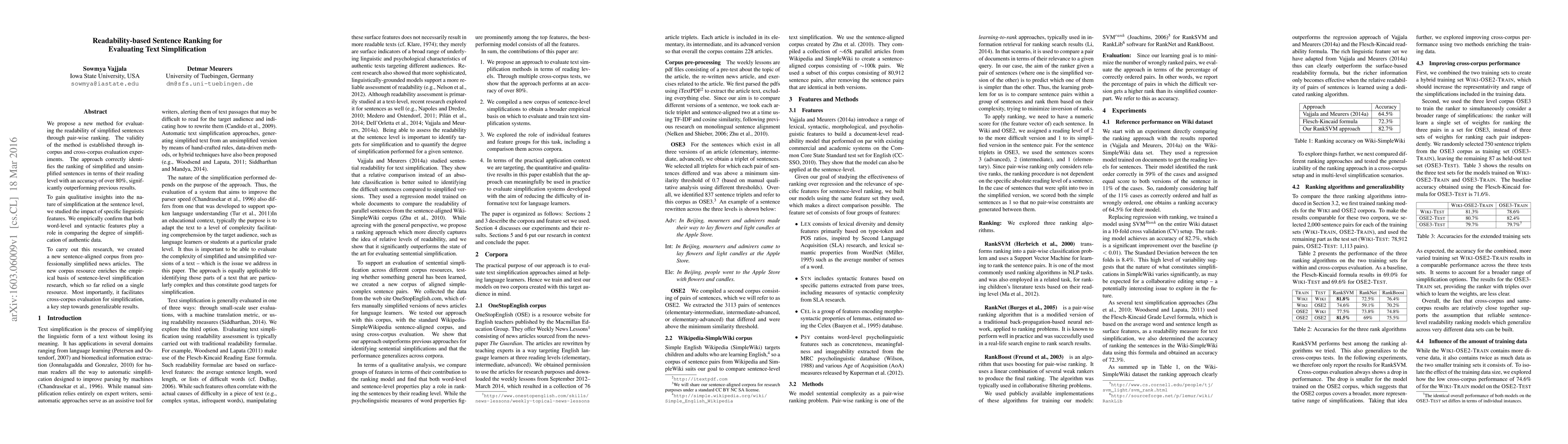 This paper introduces a novel readability-based method for ranking simplified sentences, achieving over 80% accuracy in comparison to unsimplified sentences. The method leverages both word-level and syntactic features, and a new sentence-aligned corpus was created to enhance cross-corpus evaluation and generalizability in text simplification research.