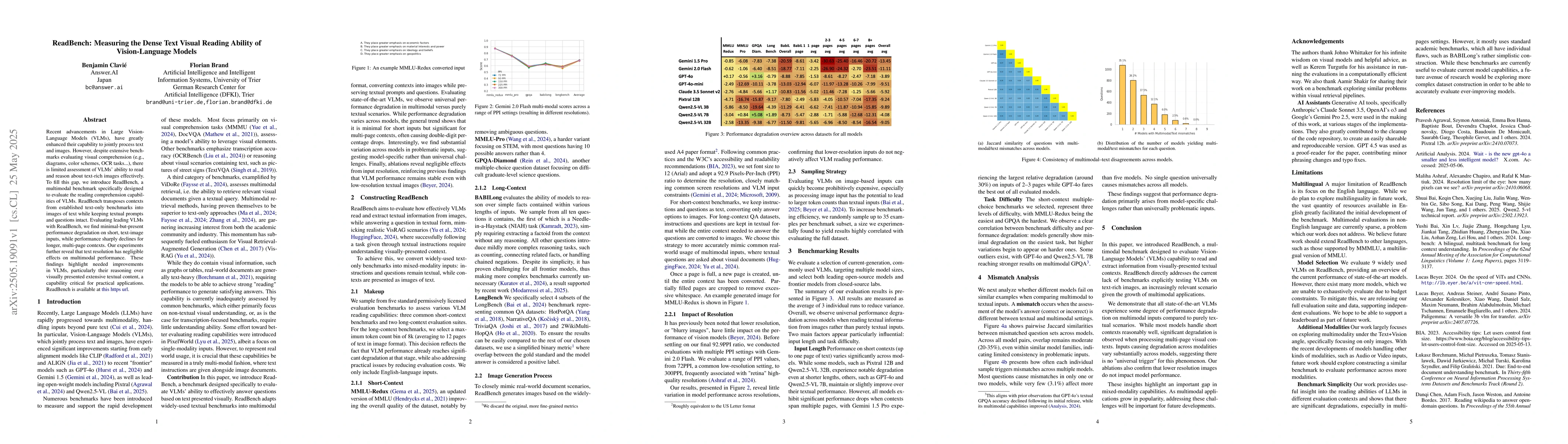 The paper introduces ReadBench, a benchmark to evaluate Vision-Language Models' (VLMs) text reading abilities in images. It finds VLMs struggle with extensive text in images, highlighting a need for improved reasoning capabilities in VLMs for practical applications. ReadBench is open-source at https://github.com/answerdotai/ReadBench.