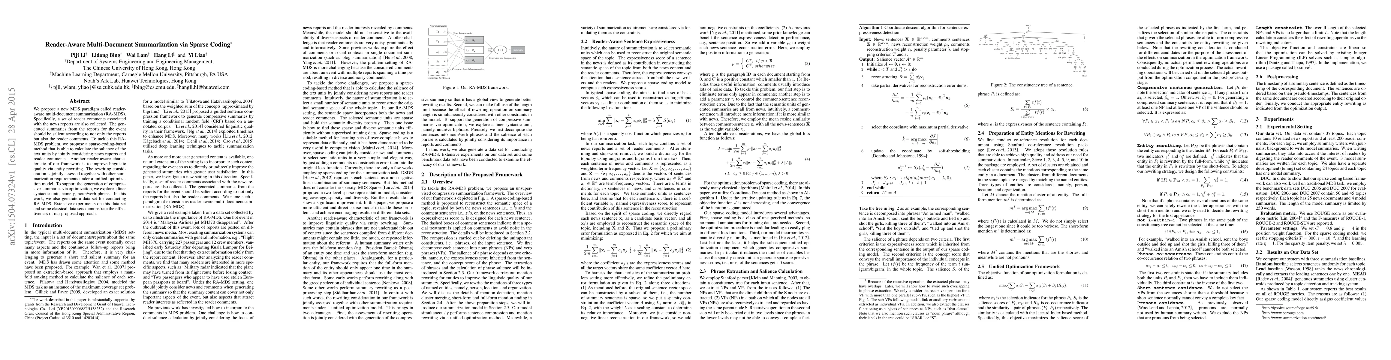 This paper introduces a reader-aware multi-document summarization (RA-MDS) paradigm that uses sparse coding to generate salient summaries by considering both news reports and reader comments. It also employs entity rewriting and syntactic units for improved linguistic quality and summarization efficiency.