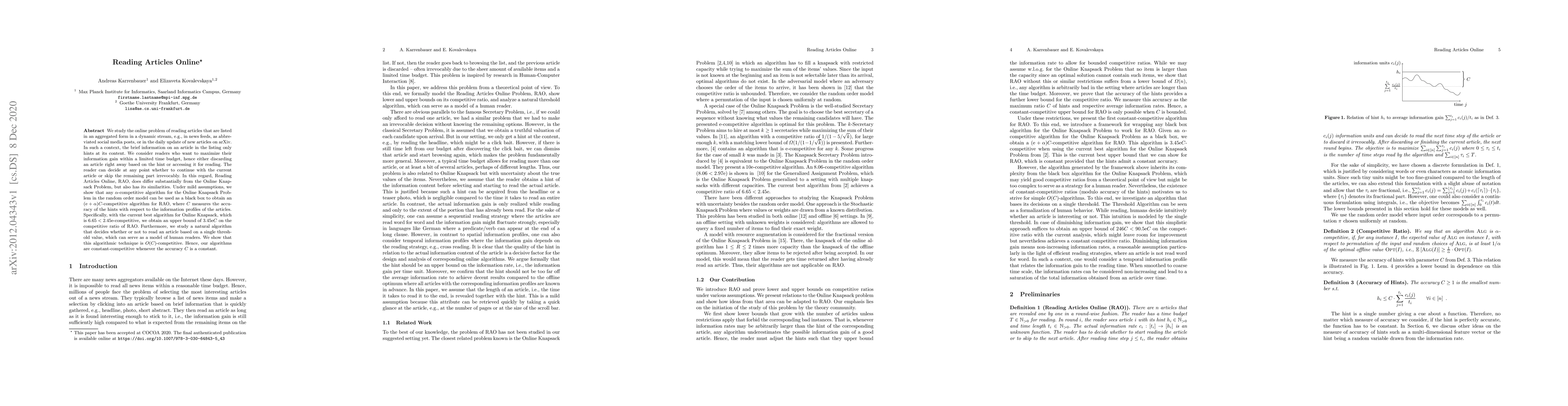 This paper investigates the problem of reading articles online in dynamic streams, where brief hints suggest article content. It proposes algorithms to maximize information gain within a time limit, showing that an $\alpha$-competitive Online Knapsack algorithm can be adapted to achieve $(\mathrm{e} + \alpha)C$-competitive performance for RAO, with a competitive ratio of $3.45\mathrm{e} C$ under current best practices. It also examines a threshold-based algorithm, demonstrating $O(C)$-competitiveness, which remains constant when hint accuracy is constant.