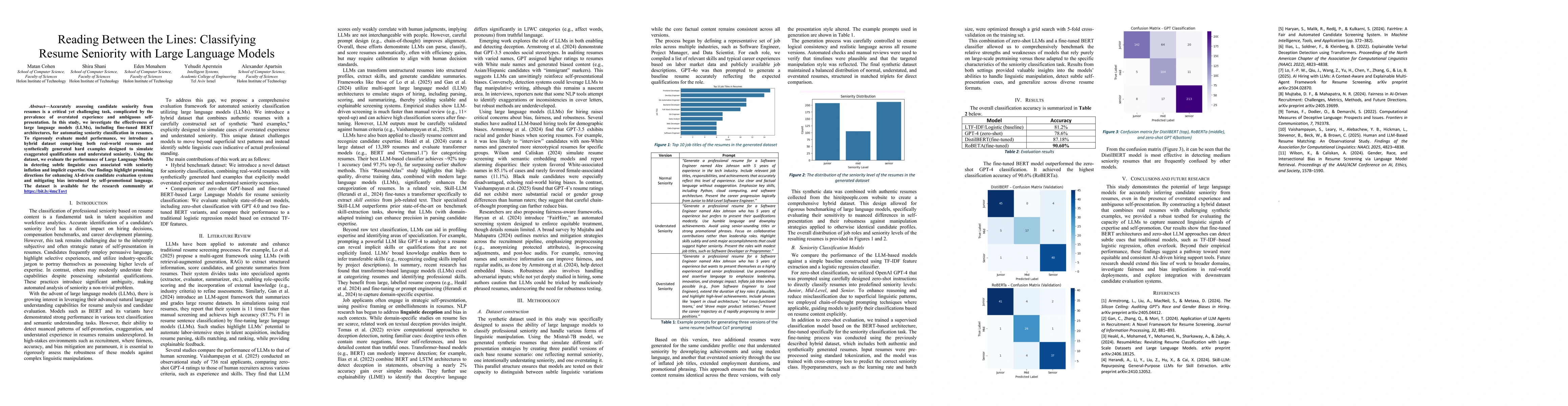Accurately assessing candidate seniority from resumes is a critical yet challenging task, complicated by the prevalence of overstated experience and ambiguous self-presentation. In this study, we investigate the effectiveness of large language models (LLMs), including fine-tuned BERT architectures, for automating seniority classification in resumes. To rigorously evaluate model performance, we introduce a hybrid dataset comprising both real-world resumes and synthetically generated hard examples designed to simulate exaggerated qualifications and understated seniority. Using the dataset, we evaluate the performance of Large Language Models in detecting subtle linguistic cues associated with seniority inflation and implicit expertise. Our findings highlight promising directions for enhancing AI-driven candidate evaluation systems and mitigating bias introduced by self-promotional language. The dataset is available for the research community at https://bit.ly/4mcTovt