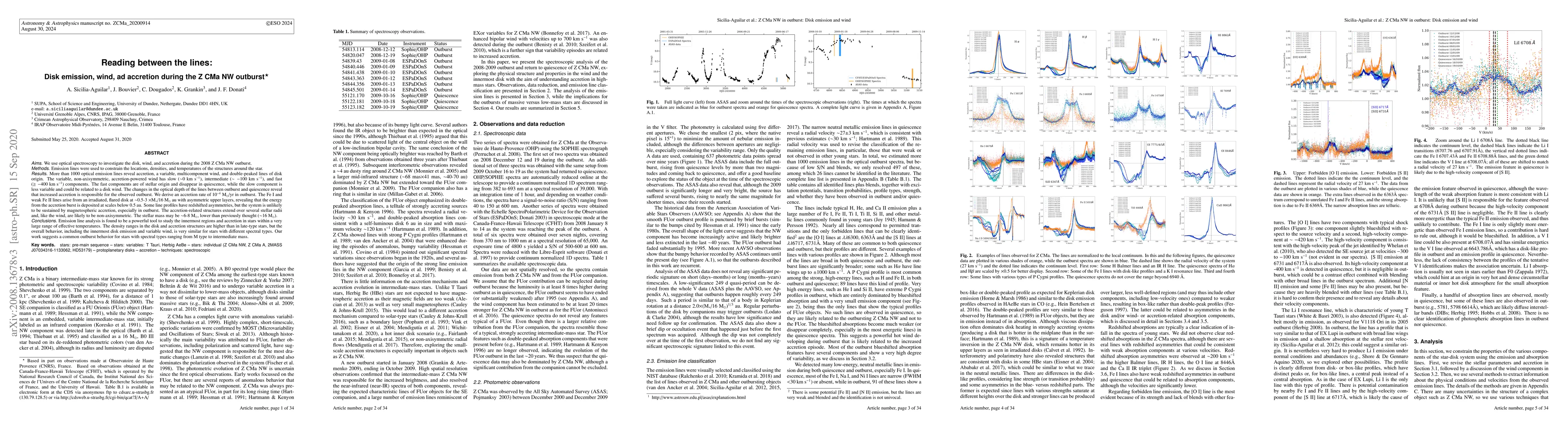 (Abridged) We use optical spectroscopy to investigate the disk, wind, and accretion during the 2008 ZCMa NW outburst. Over 1000 optical emission lines reveal accretion, a variable, multi-component wind, and double-peaked lines of disk origin. The variable, non-axisymmetric, accretion-powered wind has slow ($\sim $0 km s$^{-1}$), intermediate ($\sim -$100 km s$^{-1}$) and fast ($\geq -$400 km s$^{-1}$) components. The fast components are of stellar origin and disappear in quiescence, while the slow component is less variable and could be related to a disk wind. The changes in the optical depth of the lines between outburst and quiescence are consistent with increased accretion being responsible for the observed outburst. We derive an accretion rate of 10$^{-4}$ M$_\odot$/yr in outburst. The Fe I and weak Fe II lines arise from an irradiated, flared disk at $\sim$0.5-3 $\times$M$_*$/16M$_\odot$ au with asymmetric upper layers, revealing that the energy from the accretion burst is deposited at scales below 0.5 au. Some line profiles have redshifted asymmetries, but the system is unlikely sustained by magnetospheric accretion, especially in outburst. The accretion-related structures extend over several stellar radii and, like the wind, are likely non-axisymmetric. The stellar mass may be $\sim$6-8 M$_\odot$, lower than previously thought ($\sim$16 M$_\odot$). Emission line analysis is found to be a powerful tool to study the innermost regions and accretion in stars within a very large range of effective temperatures. The density ranges in the disk and accretion structures are higher than in late-type stars, but the overall behavior, including the innermost disk emission and variable wind, is very similar independently of the spectral type. Our work suggests a common outburst behavior for stars with spectral types ranging from M-type to intermediate-mass stars.