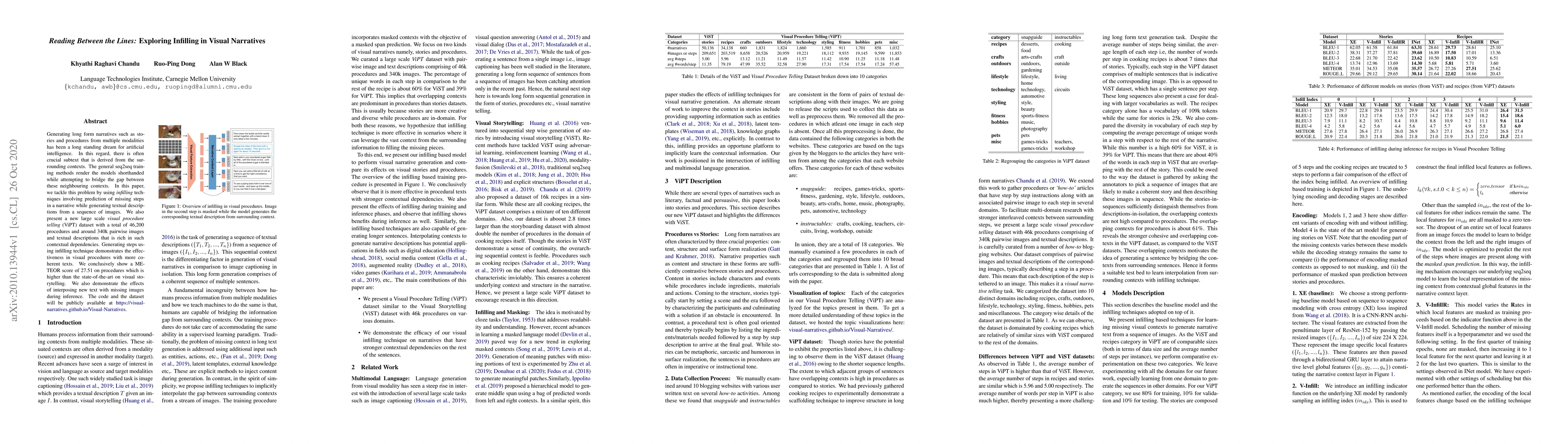 Generating long form narratives such as stories and procedures from multiple modalities has been a long standing dream for artificial intelligence. In this regard, there is often crucial subtext that is derived from the surrounding contexts. The general seq2seq training methods render the models shorthanded while attempting to bridge the gap between these neighbouring contexts. In this paper, we tackle this problem by using \textit{infilling} techniques involving prediction of missing steps in a narrative while generating textual descriptions from a sequence of images. We also present a new large scale \textit{visual procedure telling} (ViPT) dataset with a total of 46,200 procedures and around 340k pairwise images and textual descriptions that is rich in such contextual dependencies. Generating steps using infilling technique demonstrates the effectiveness in visual procedures with more coherent texts. We conclusively show a METEOR score of 27.51 on procedures which is higher than the state-of-the-art on visual storytelling. We also demonstrate the effects of interposing new text with missing images during inference. The code and the dataset will be publicly available at https://visual-narratives.github.io/Visual-Narratives/.