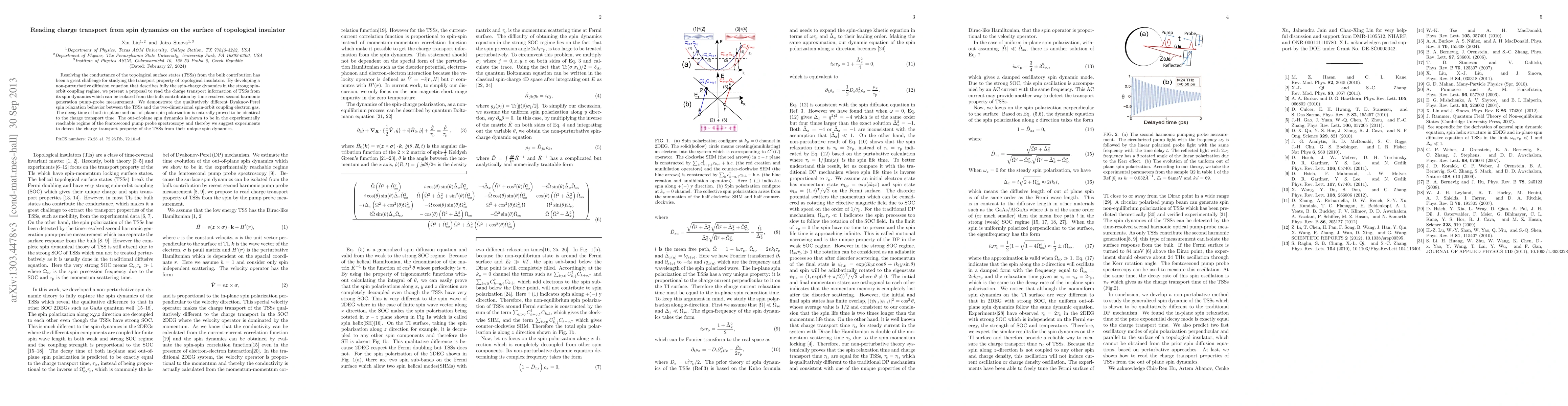 This paper proposes a method to extract charge transport information from spin dynamics on the surface of topological insulators using a non-perturbative diffusion equation. It demonstrates that the spin relaxation behavior of topological surface states can be isolated from bulk contributions and suggests femtosecond pump-probe spectroscopy as a viable experimental technique to detect these properties.