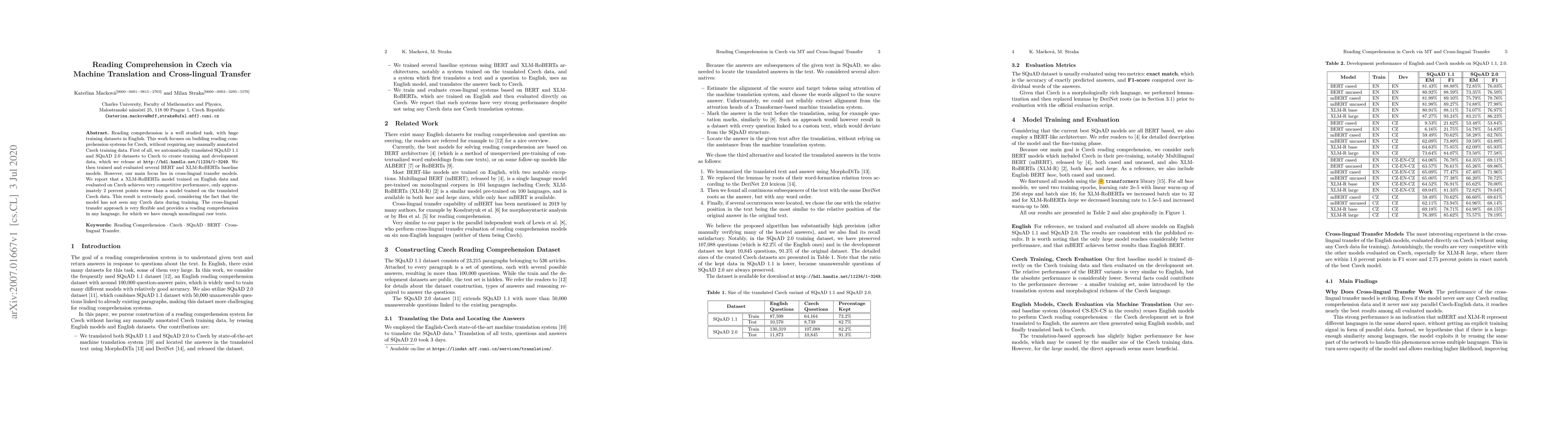 Reading comprehension is a well studied task, with huge training datasets in English. This work focuses on building reading comprehension systems for Czech, without requiring any manually annotated Czech training data. First of all, we automatically translated SQuAD 1.1 and SQuAD 2.0 datasets to Czech to create training and development data, which we release at http://hdl.handle.net/11234/1-3249. We then trained and evaluated several BERT and XLM-RoBERTa baseline models. However, our main focus lies in cross-lingual transfer models. We report that a XLM-RoBERTa model trained on English data and evaluated on Czech achieves very competitive performance, only approximately 2 percent points worse than a~model trained on the translated Czech data. This result is extremely good, considering the fact that the model has not seen any Czech data during training. The cross-lingual transfer approach is very flexible and provides a reading comprehension in any language, for which we have enough monolingual raw texts.